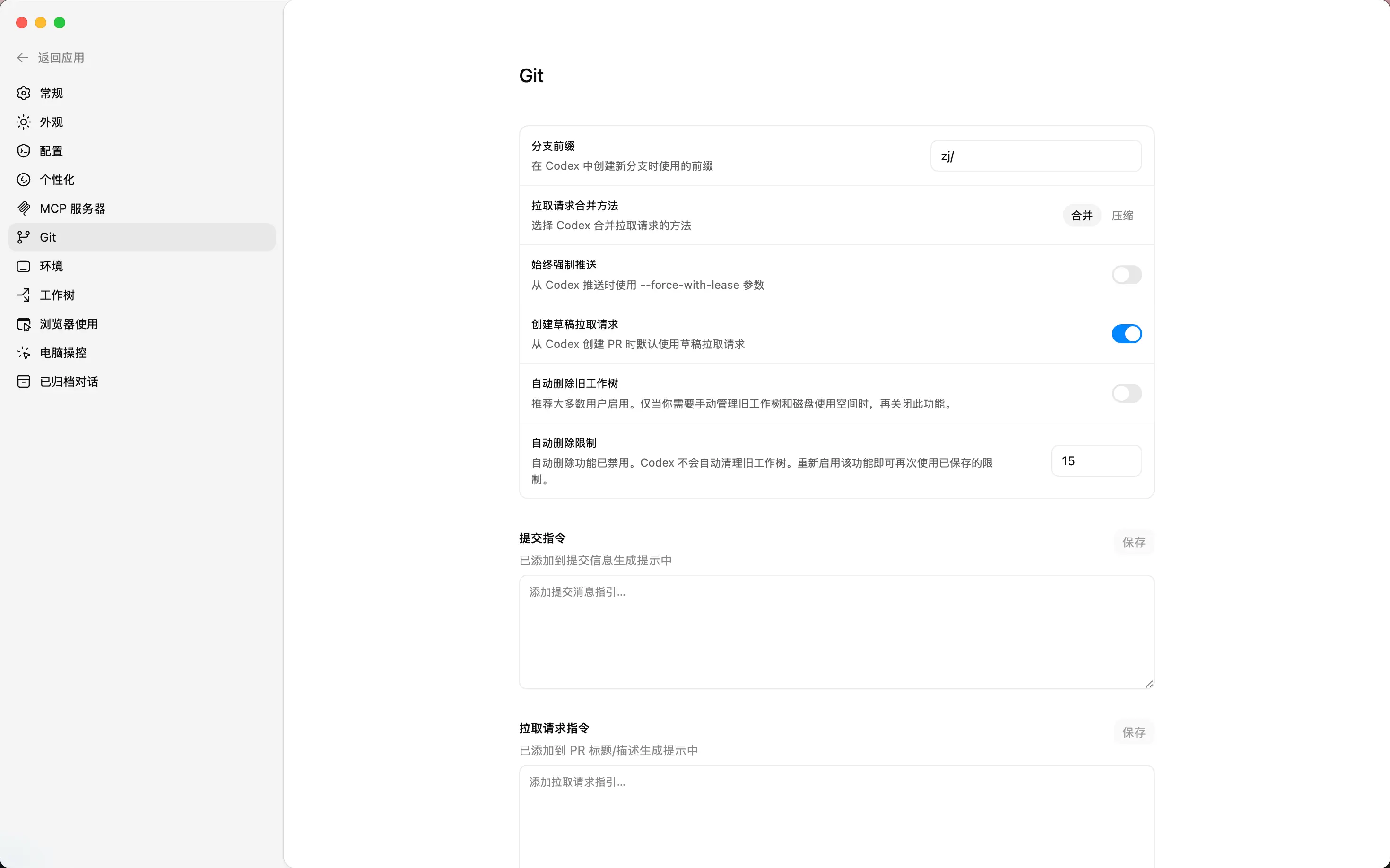 - 分支名前缀:创建分支或 Worktree 时默认带的前缀。