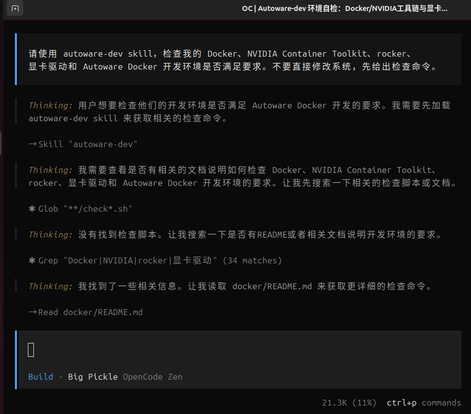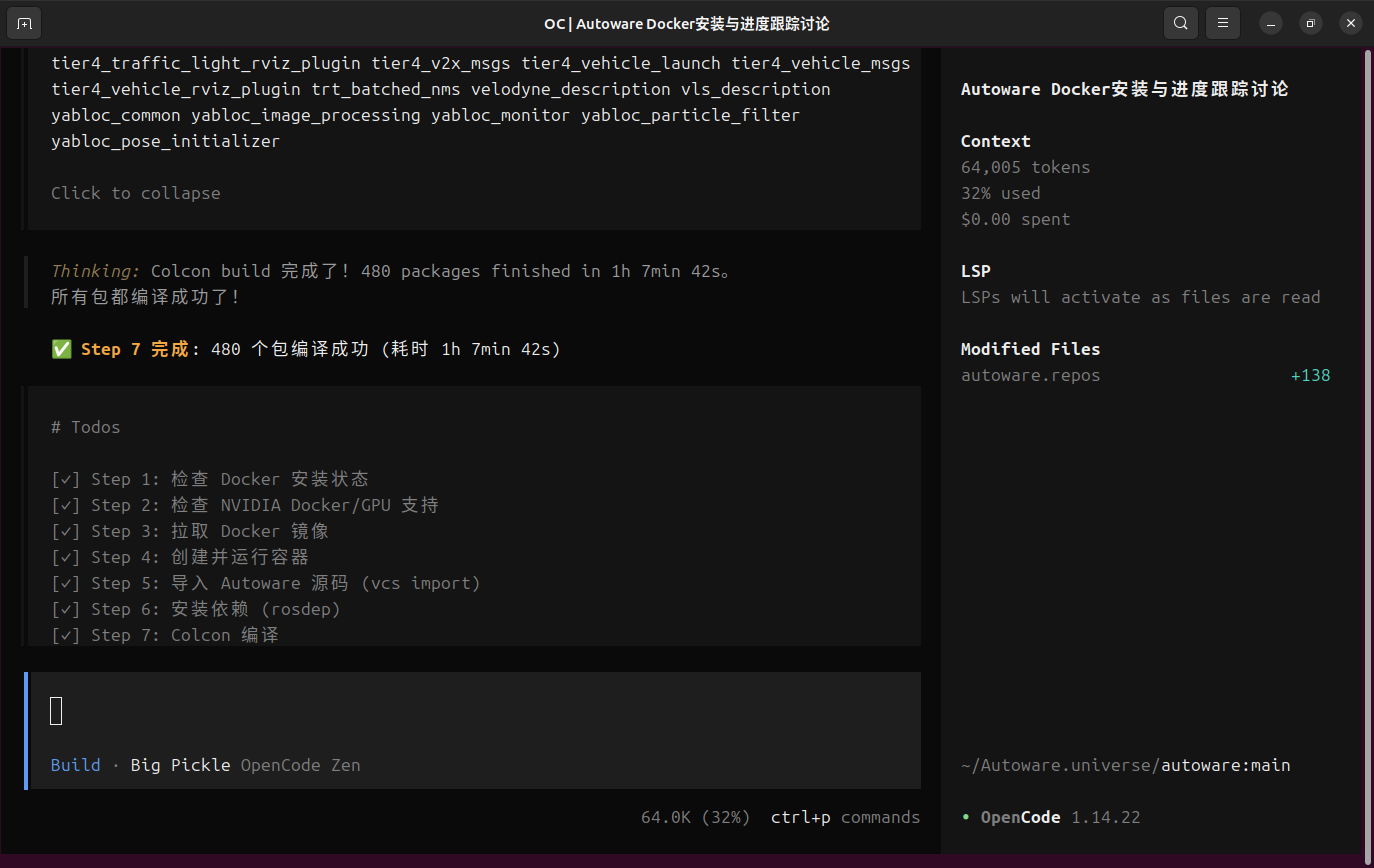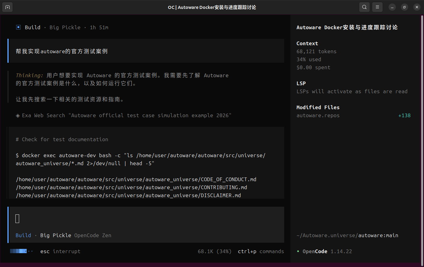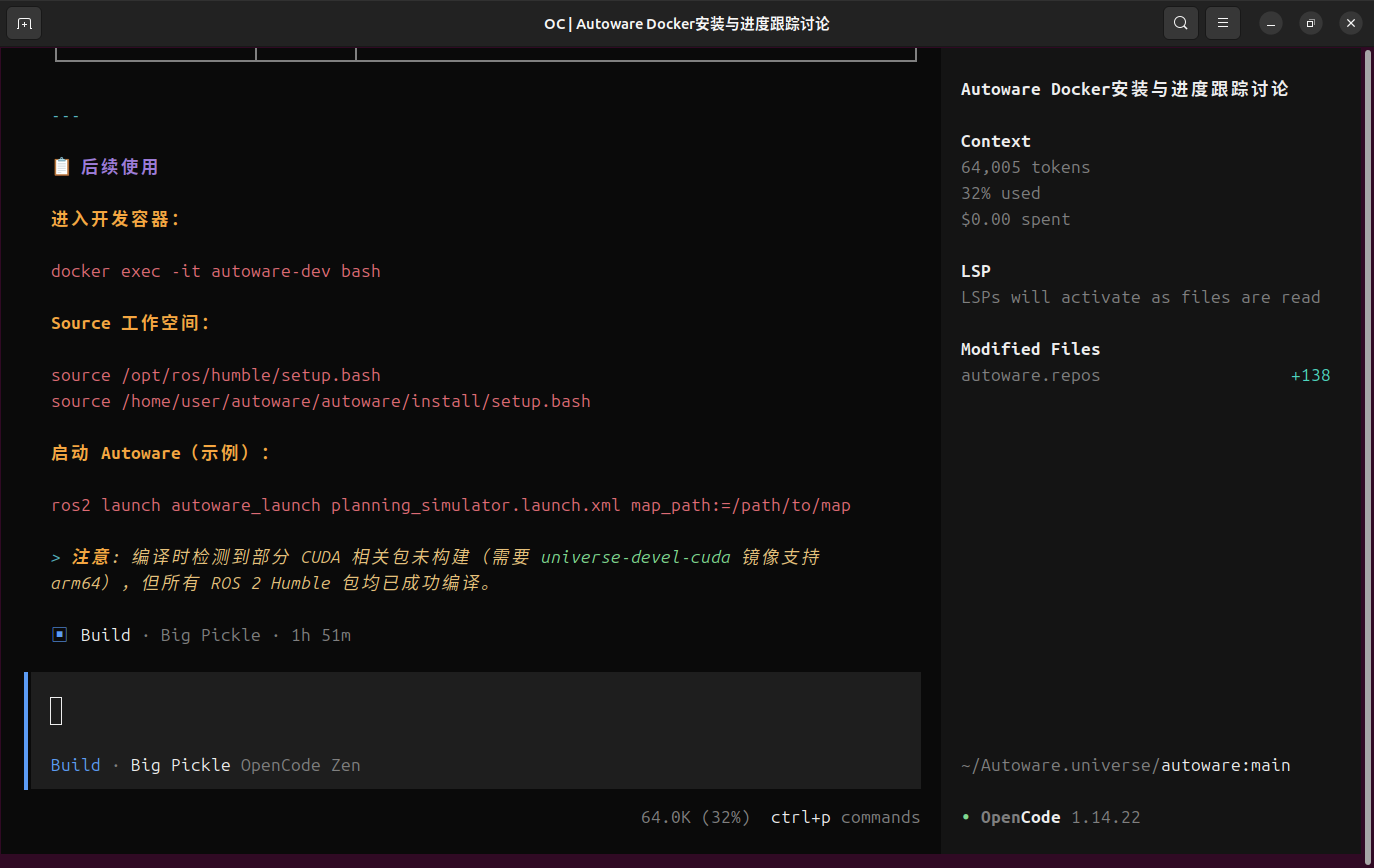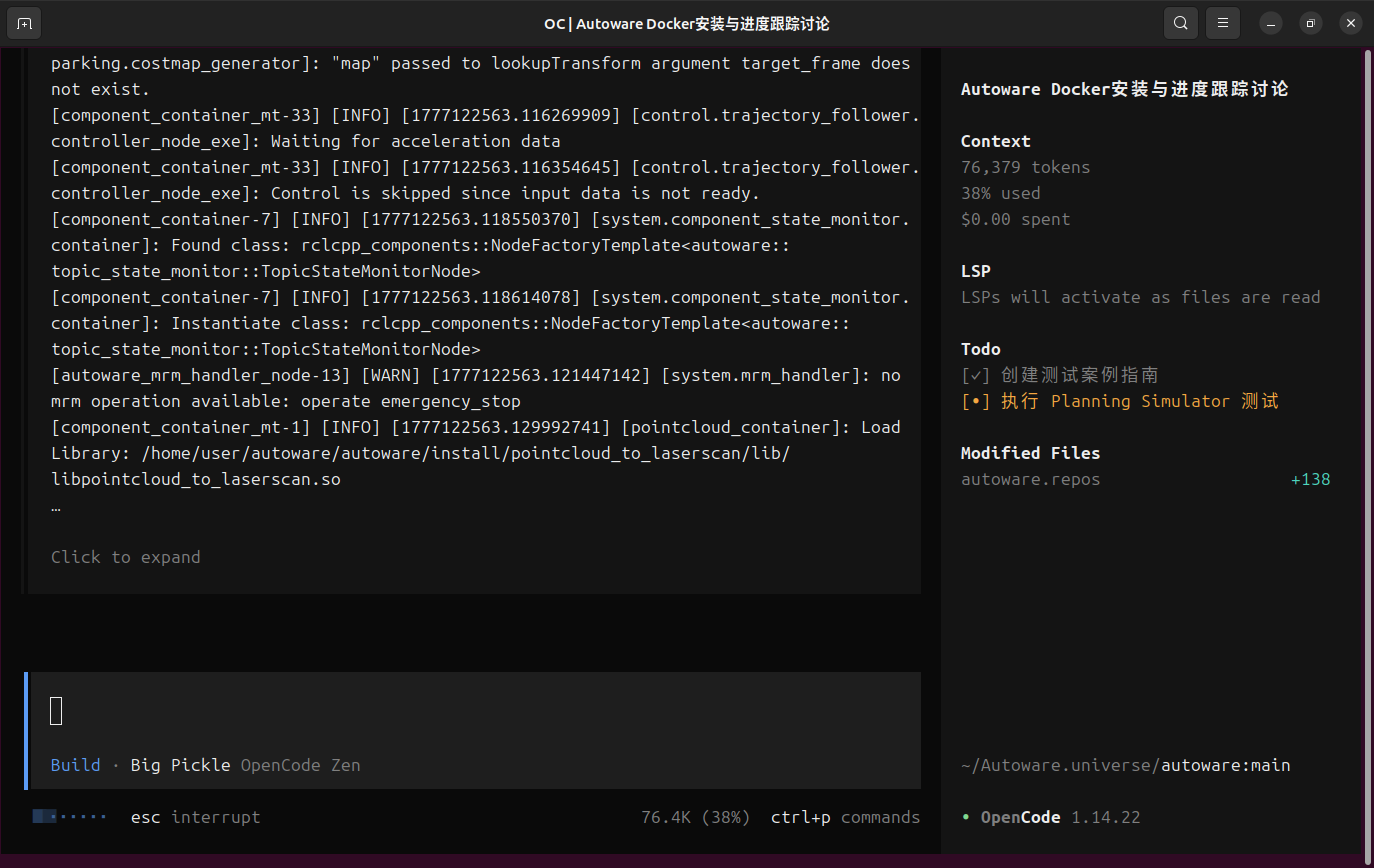 由于人工手动安装autoware设计多个依赖以及版本的对应关系,安装编译耗费时间以及经历。故而使用opencode可以节省成本,本文探索内容如下,已经验证成功,实现自动安装编译
