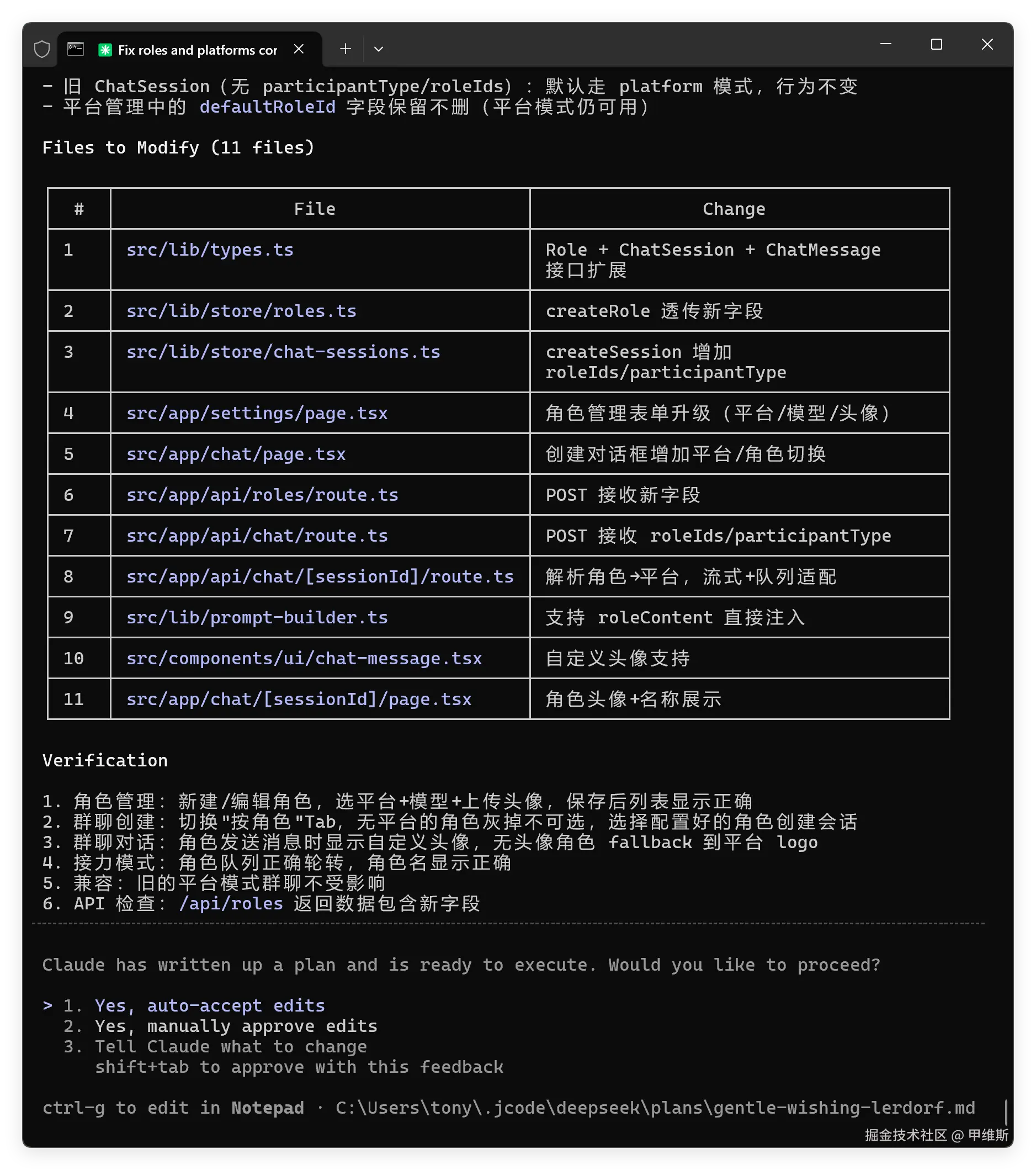 V4 Pro 这一趴是做得不错的。计划已经很清晰了,修改哪些文件写得清清楚楚,而且还提出了6个验证点。