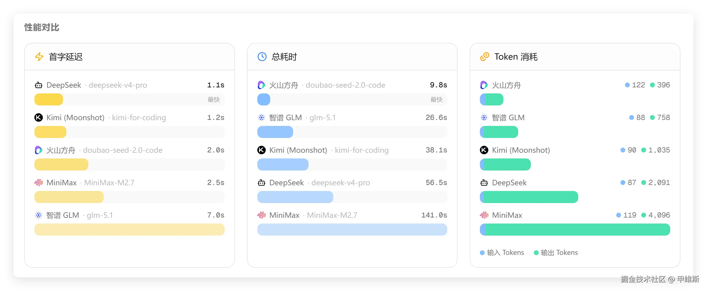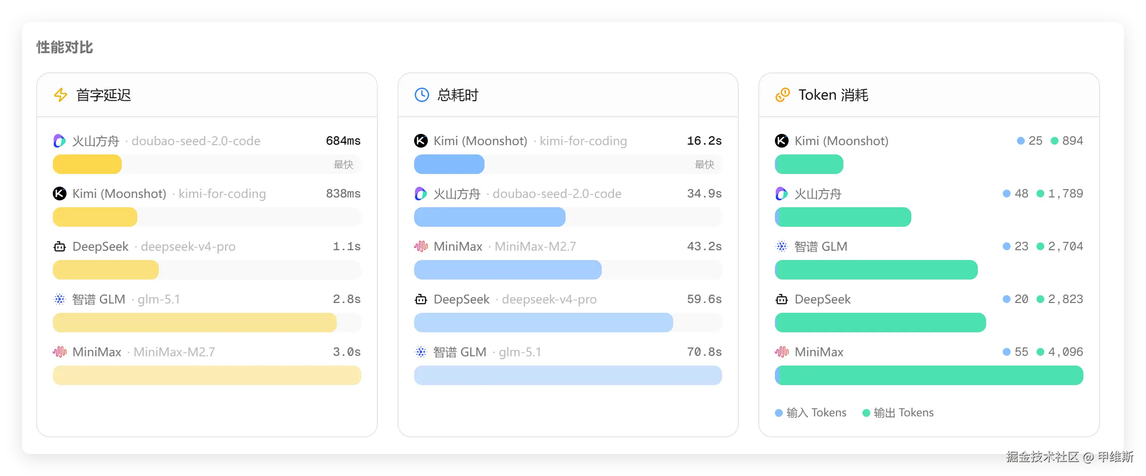 这次DS的首字又是最快,GLM最慢,总耗时是火山最快,MiniMax最慢,Tokens 方面 DS和MinMax都消耗比较多。