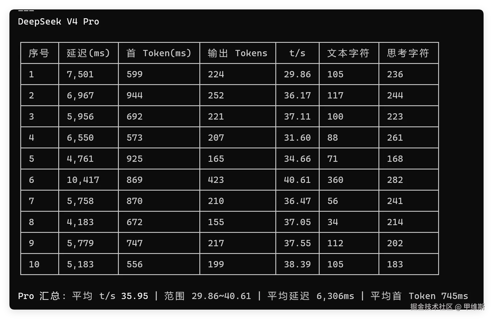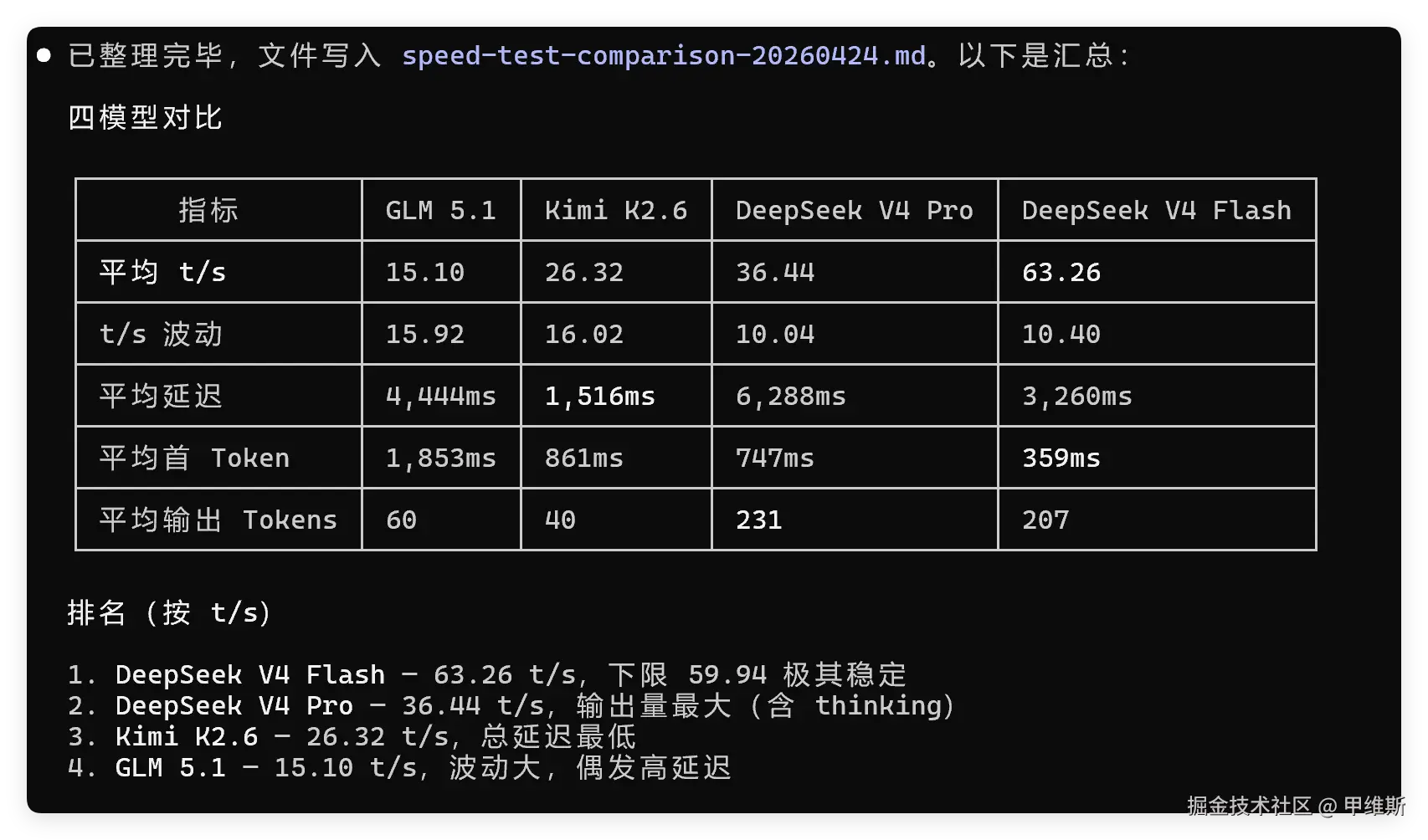 因为我在上一次测试的时候,发现DeepSeek V4 Pro消耗的时间还是比较久的,做一个网页,都能十几分钟,所以我很好奇,它的 tokens/s 数据如何。