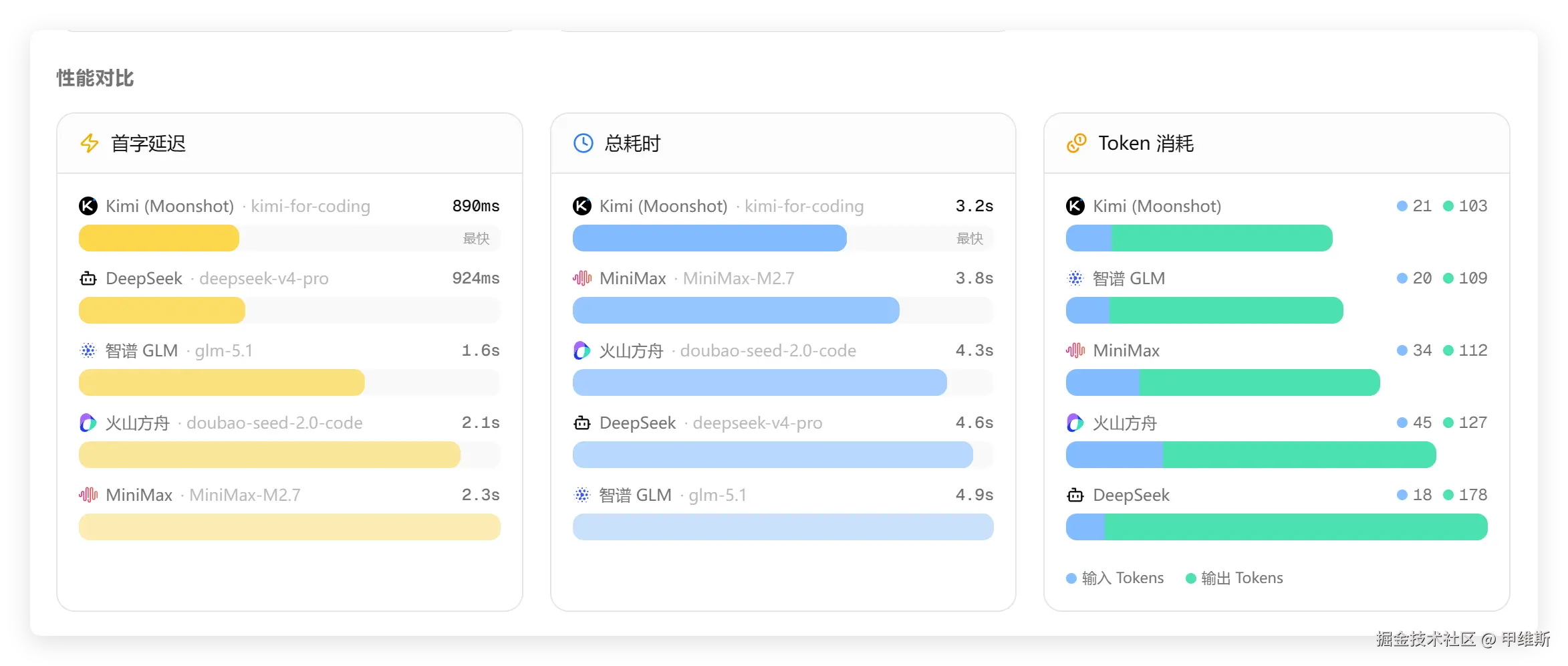 火山现在好像速度快了不少,Kimi总耗时最短,Tokens消耗最少。