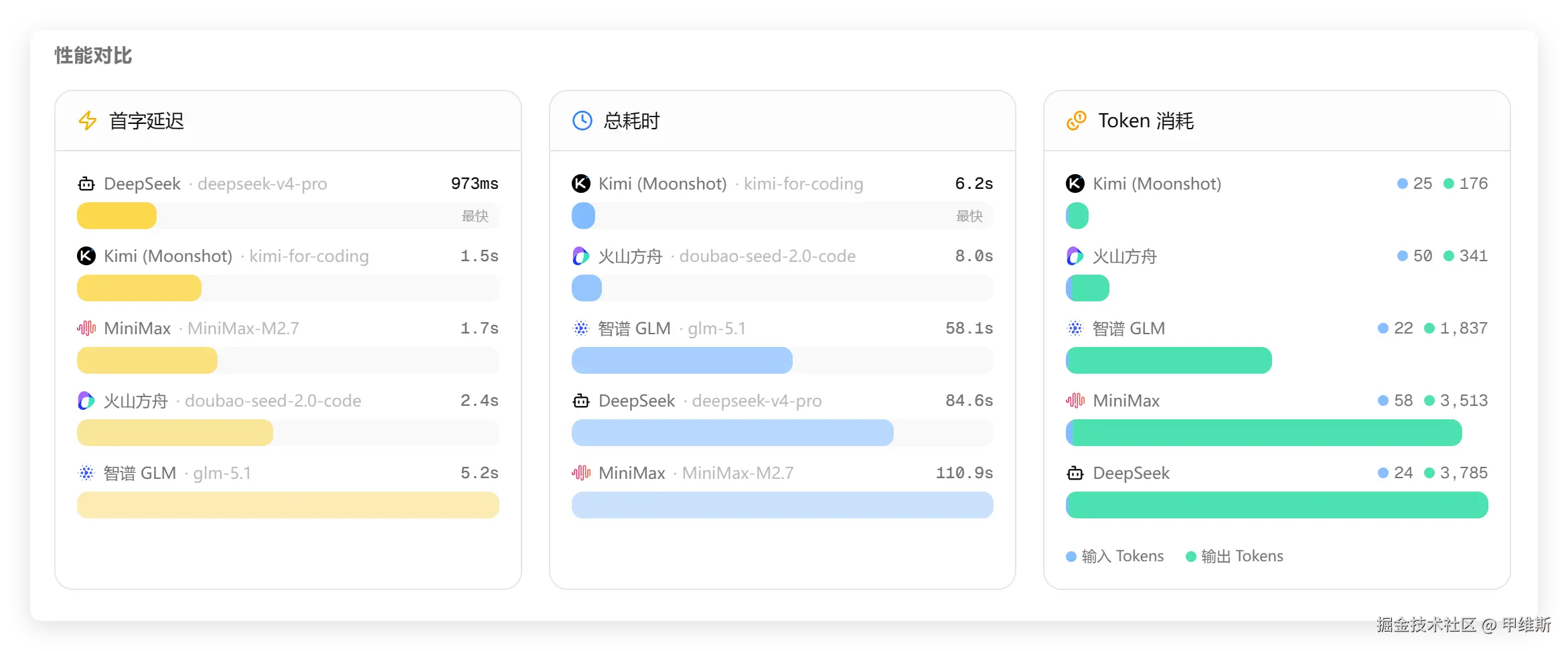 DS这次首字居然最快,GLM最慢,但是整体耗时 DeepSeek 就比较久了,MiniMax最久。DeepSeek的Tokens消耗最多。