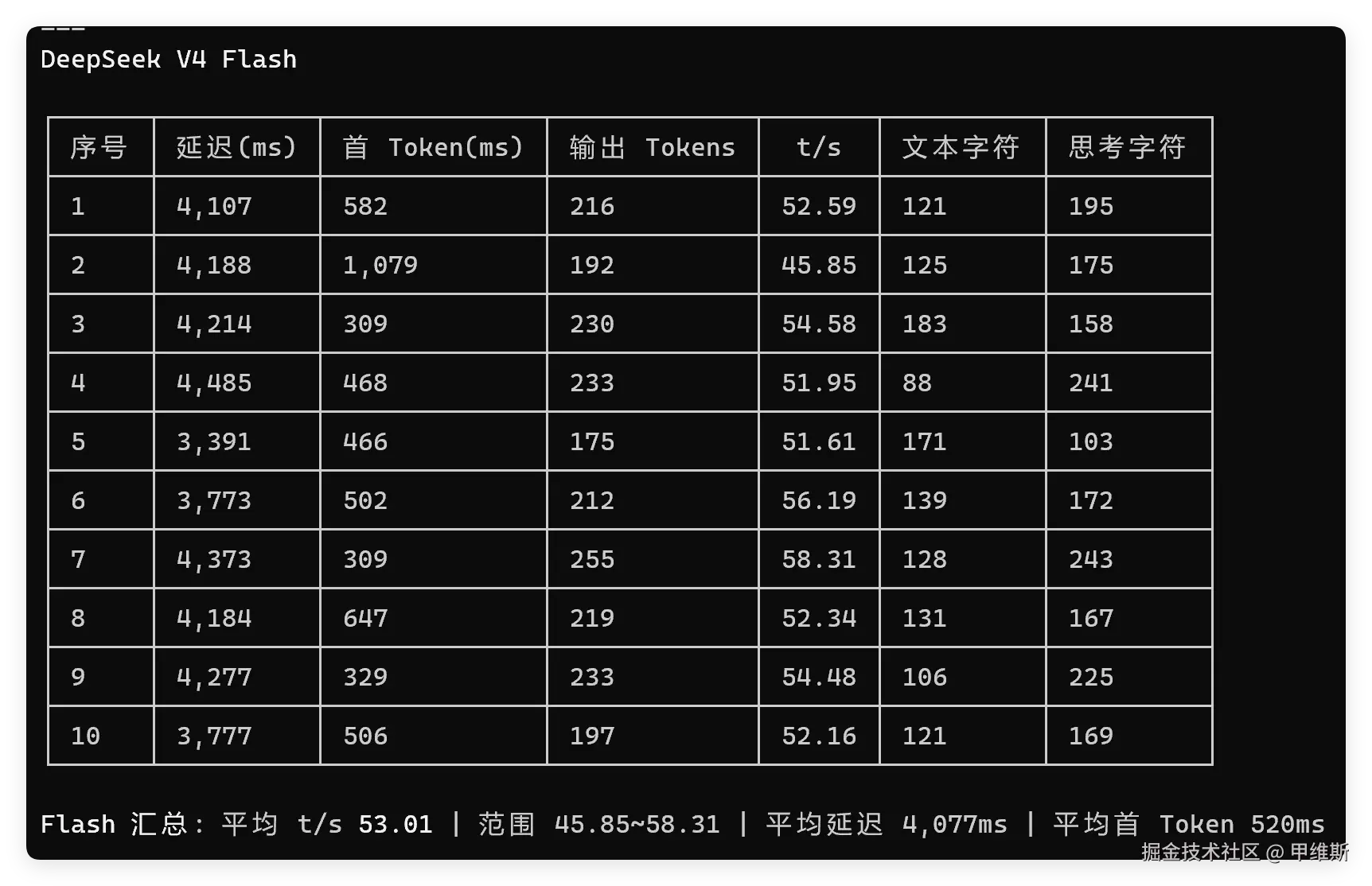 所以我就叫GLM5-Turbo帮我写了一个基于Anthropic协议的测试脚本,测了10次。顺带把V4 Flash也测了。