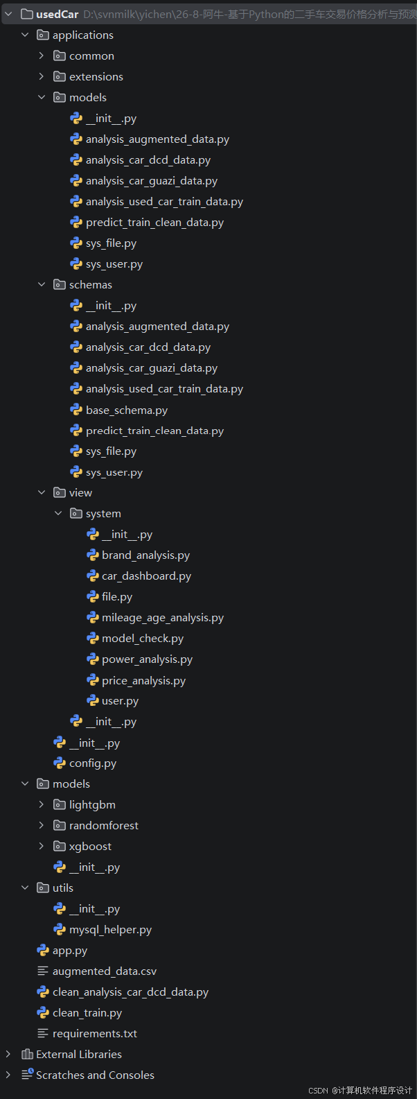 这是一个典型的前后端分离的 Flask 项目,后端提供 RESTful API,前端(未在截图中出现)通过调用这些接口展示数据看板、进行价格预测分析。
