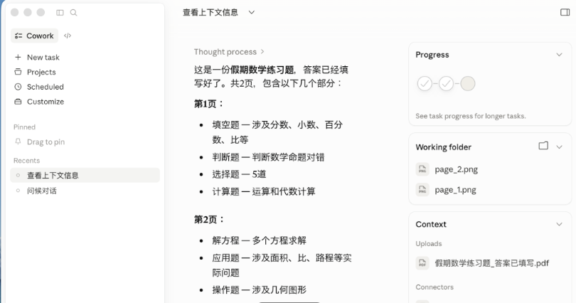 Cowork可直接访问指定的文件夹,读写 Word、PDF、Excel、PowerPoint、图片、CSV、JSON 等各种文件。