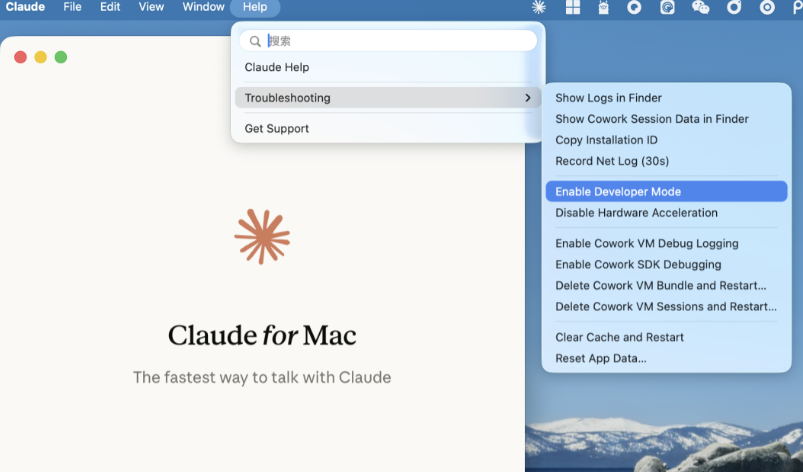 Help(帮助) → Troubleshooting(故障排除) → Enable Developer Mode(启用开发者模式)