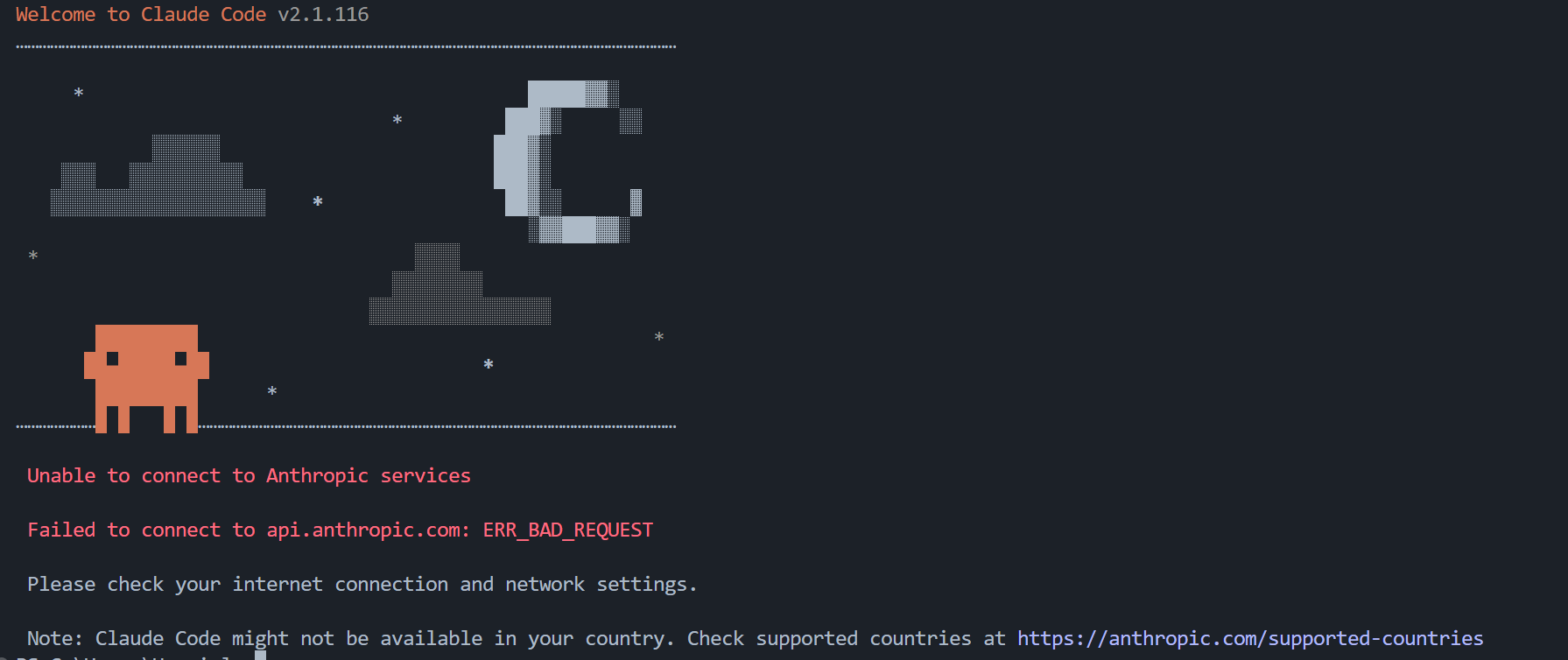 安装完成后,首次执行claude命令会触发区域校验报错,这是由于官方的地区访问限制导致的,我们可以通过修改配置文件绕过该限制。