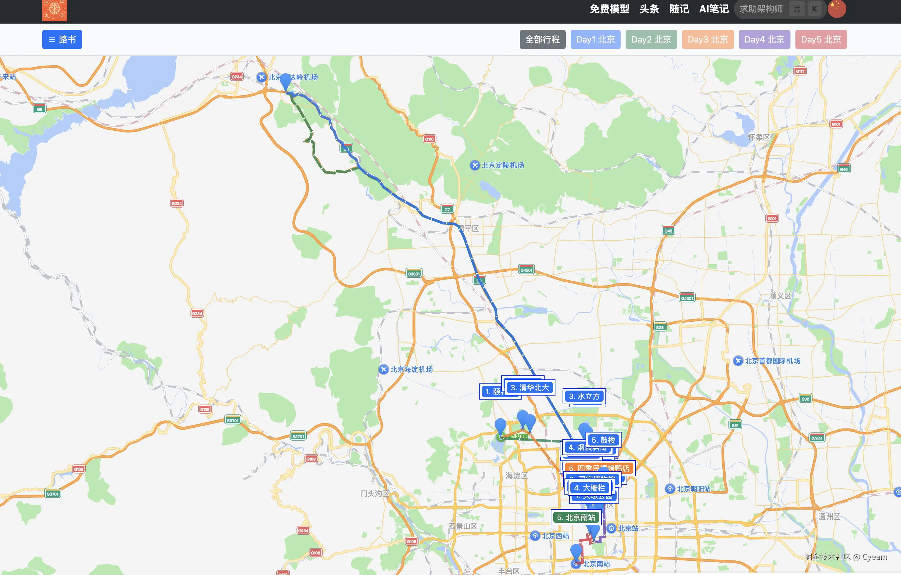 Claude 会自动整理成标准 CSV,调用 API,秒回你一个高德地图链接,打开就是完整的路书,所有地点都在地图上标好了,还能按天切换。