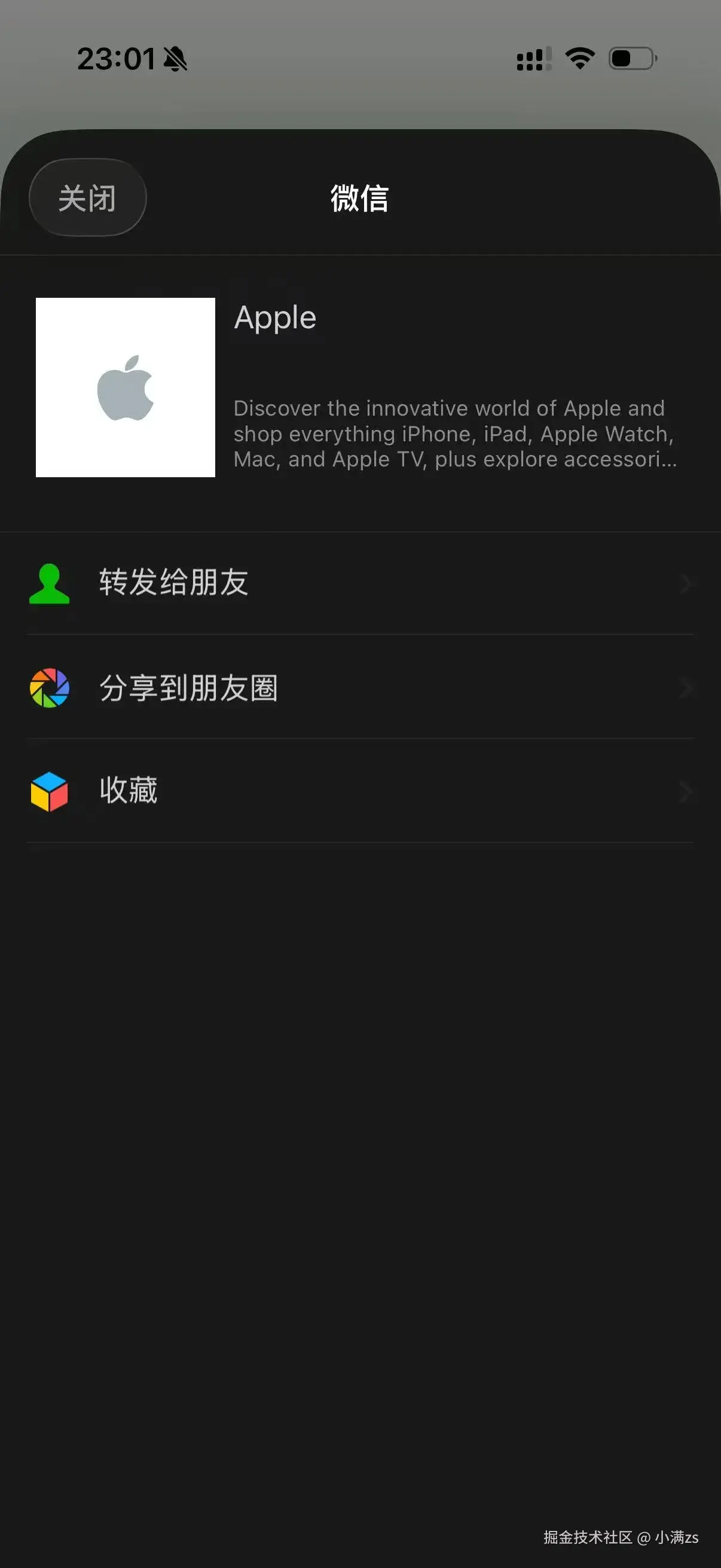 在微信里转发该链接时,客户端会按上述字段拼出链接卡片 :左侧一般为 og:image(此处为白底灰苹果 Logo),右侧为 og:title 粗体标题,其下为 og:description 摘要(各客户端会按自己的规则截断并加省略号)。