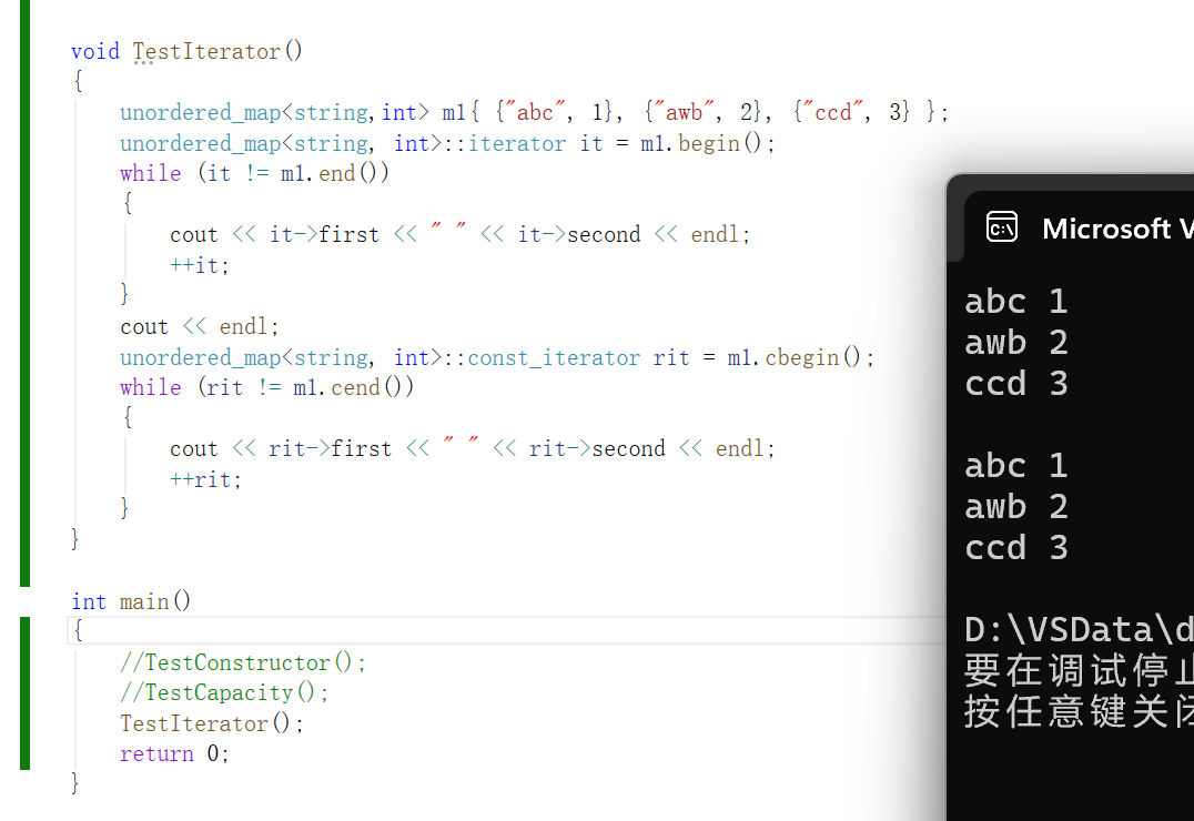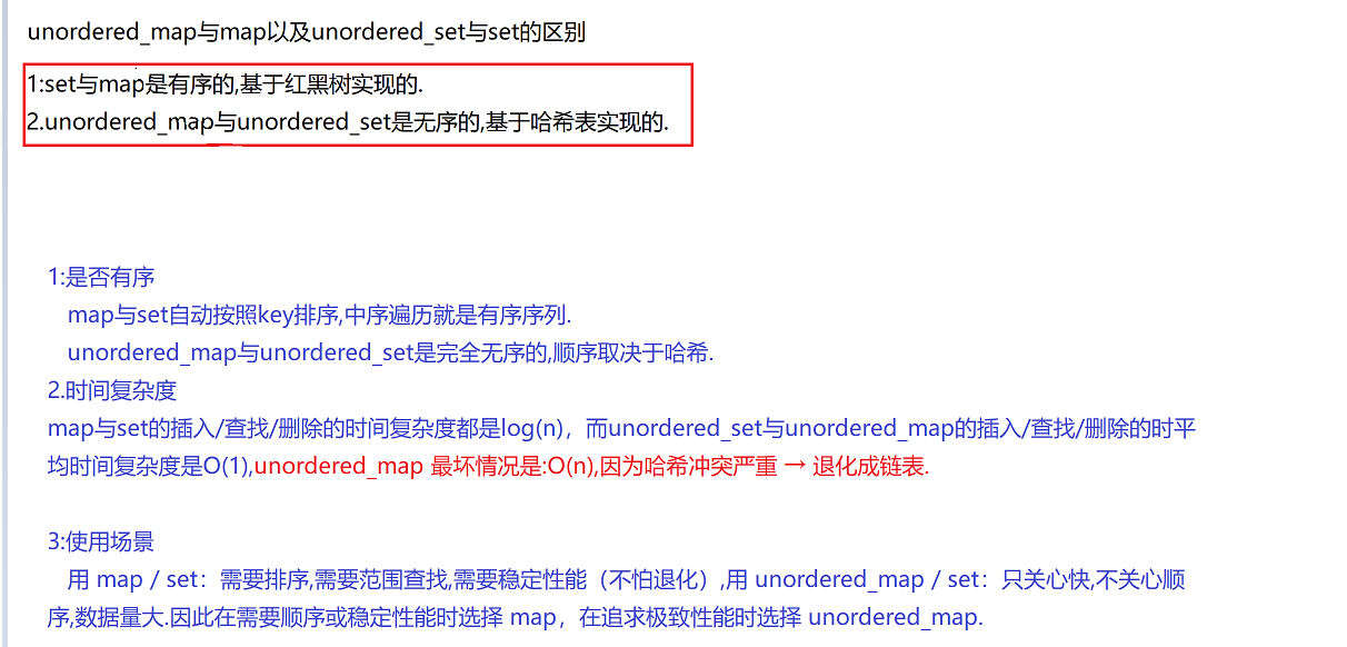 unordered_map要求Key支持转成整形且支持等于比较,要理解unordered_map的这个两点要求得后续结合哈希表底层实现才能真正理解,也就是说这本质是哈希表的要求。 - unordered_map和map的第二个差异是迭代器的差异,map的iterator是双向迭代器,unordered_map是单向迭代器,其次map底层是红黑树,红黑树是二叉搜索树,走中序遍历是有序的 ,所以map迭代器遍历是Key有序 + 去重。而 unordered_map底层是哈希表,迭代器遍历是Key无序+去重.