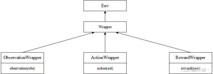 在实际应用中,我们经常需要以通用方式扩展环境功能。例如:某个环境提供的观测值可能需要先存入缓冲区,再向智能体提供最近 N 次观测记录------这在动态电子游戏场景中很常见,因为单帧画面往往无法反映完整游戏状态。又如需要对图像像素进行裁剪或预处理,使其更易于智能体处理;或对奖励分数进行归一化操作等。这类需求具有共同特征:都需要在现有环境外"包裹"额外处理逻辑,为此,Gymnasium 提供了包装器 (Wrapper) 这一便捷框架,类结构如下图所示。