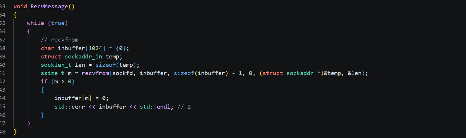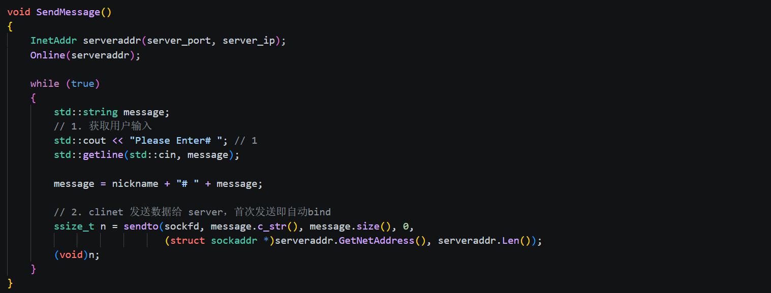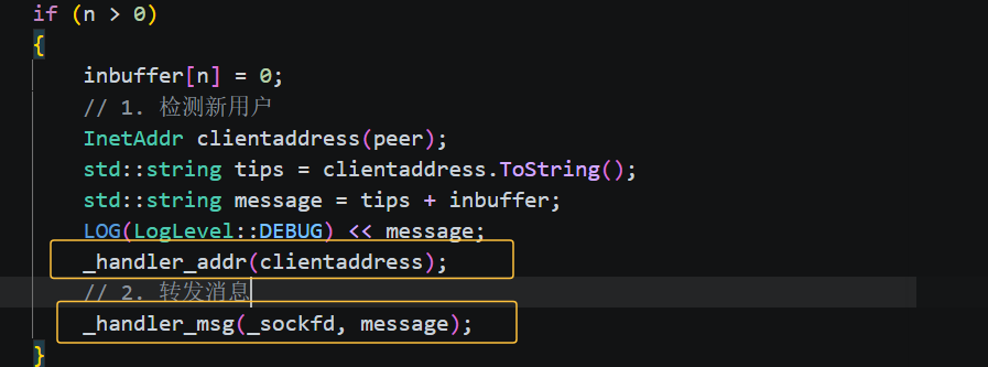我们之前的回声服务器、字典翻译服务器中,recvfrom 拿到 sockaddr_in 后,直接就用或者直接丢弃了。但在聊天室架构中,我们收到客户端地址后,第一件事就是把原生结构体包装成 InetAddr 对象,这是整个业务逻辑的起点。
