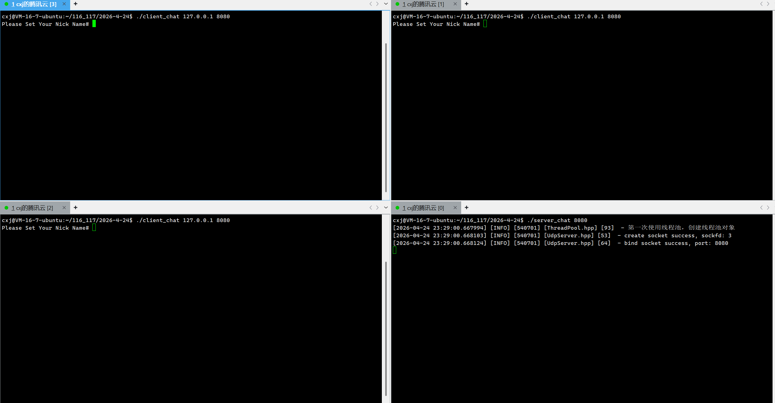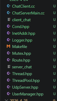 至此,整个聊天室服务器的架构设计完成:以 UdpServer 作为网络入口,负责纯 IO 消息接收;以 UserManager 作为数据底座,管理在线用户;以 Route 作为业务中枢,实现消息广播逻辑;以 ThreadPool 作为并发引擎,支撑多任务异步执行。各模块协同工作,既延续了前两版项目解耦、模块化的设计优势,又实现了多客户端并发、消息实时广播的核心能力,完成了从单线程服务器到多线程并发服务器的关键升级。