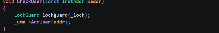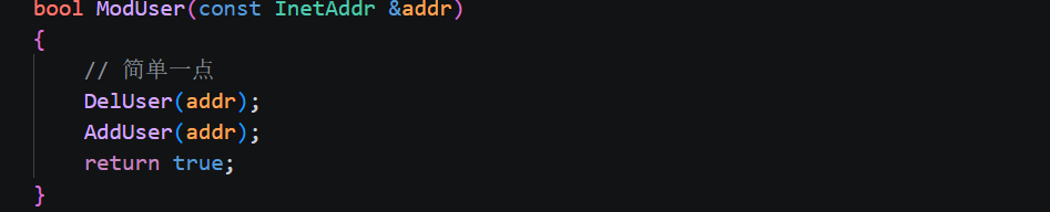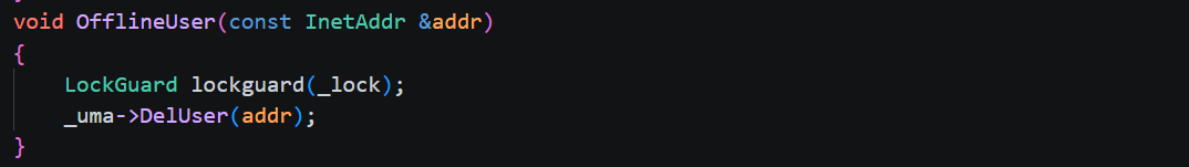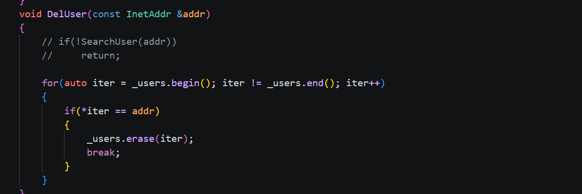 每个 InetAddr 对象,都包含了每个客户端的 IP、端口信息,并且重载了 == 运算符,支持直接对比;后续的增删查改操作,就全部基于每个 InetAddr 元素对象完成,屏蔽了底层网络地址的细节。
