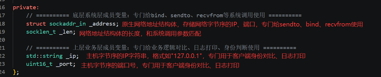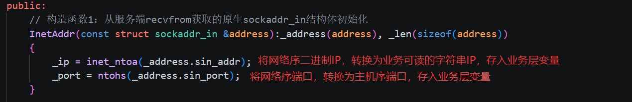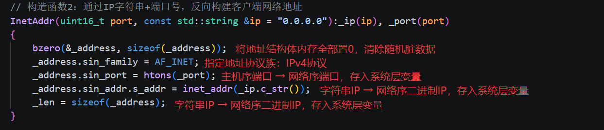 初始化列表会直接拷贝系统层的 _address 和 _len,先将网络字节序的 IP 转换为字符串 IP,存入_ip,方便可读;再将网络序端口转换为主机序端口,存入_port。