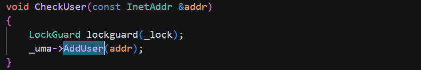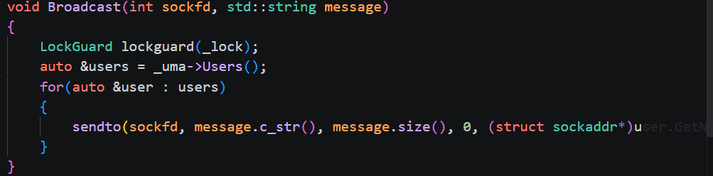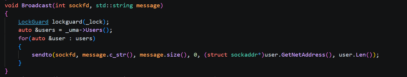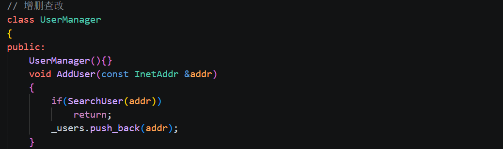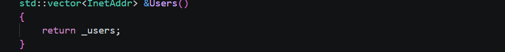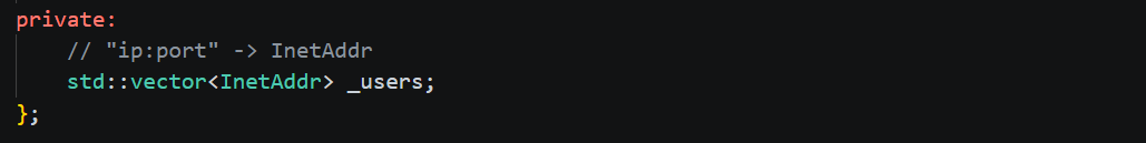 我们用 vector 数组作为底层存储的数据结构构造了一个数组 _users,数组里的元素对象就是 InetAddr 对象,没有直接对底层 sockaddr_in 结构体进行使用。