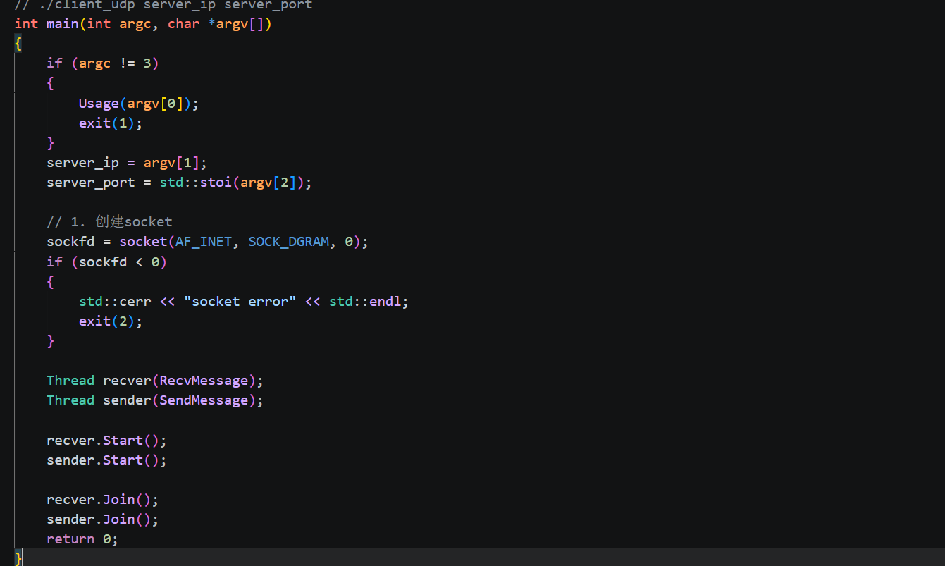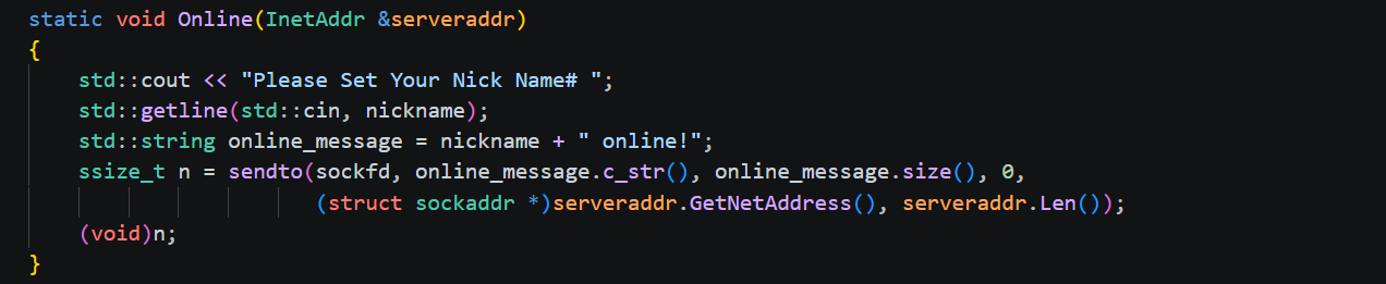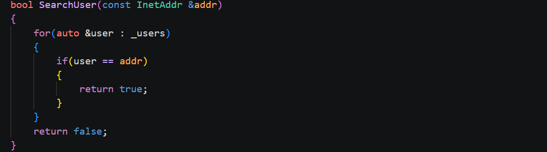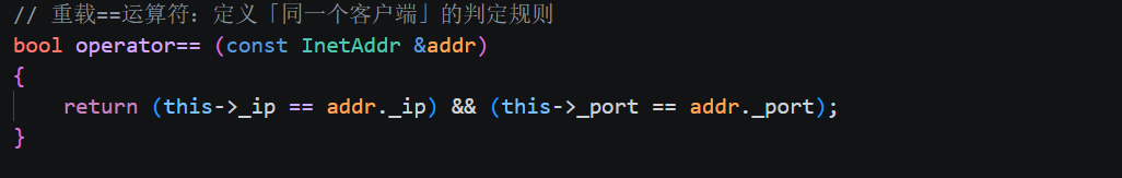 因为我们要管理大量客户端,核心操作就是判断两个网络地址是否指向同一个用户。原生的 sockaddr_in 是 C 语言结构体,C++ 不会默认帮我们做结构体内容的逐成员比较,直接用 == 对比只会比较内存地址,无法判断两个结构体里的 IP、端口是否完全一致。我们重载 == 运算符,本质就是规定了:两个客户端,只有当 IP 和端口完全相同时,才判定为同一个客户端。