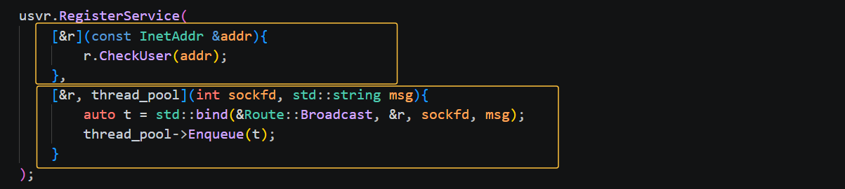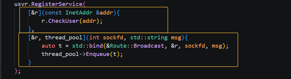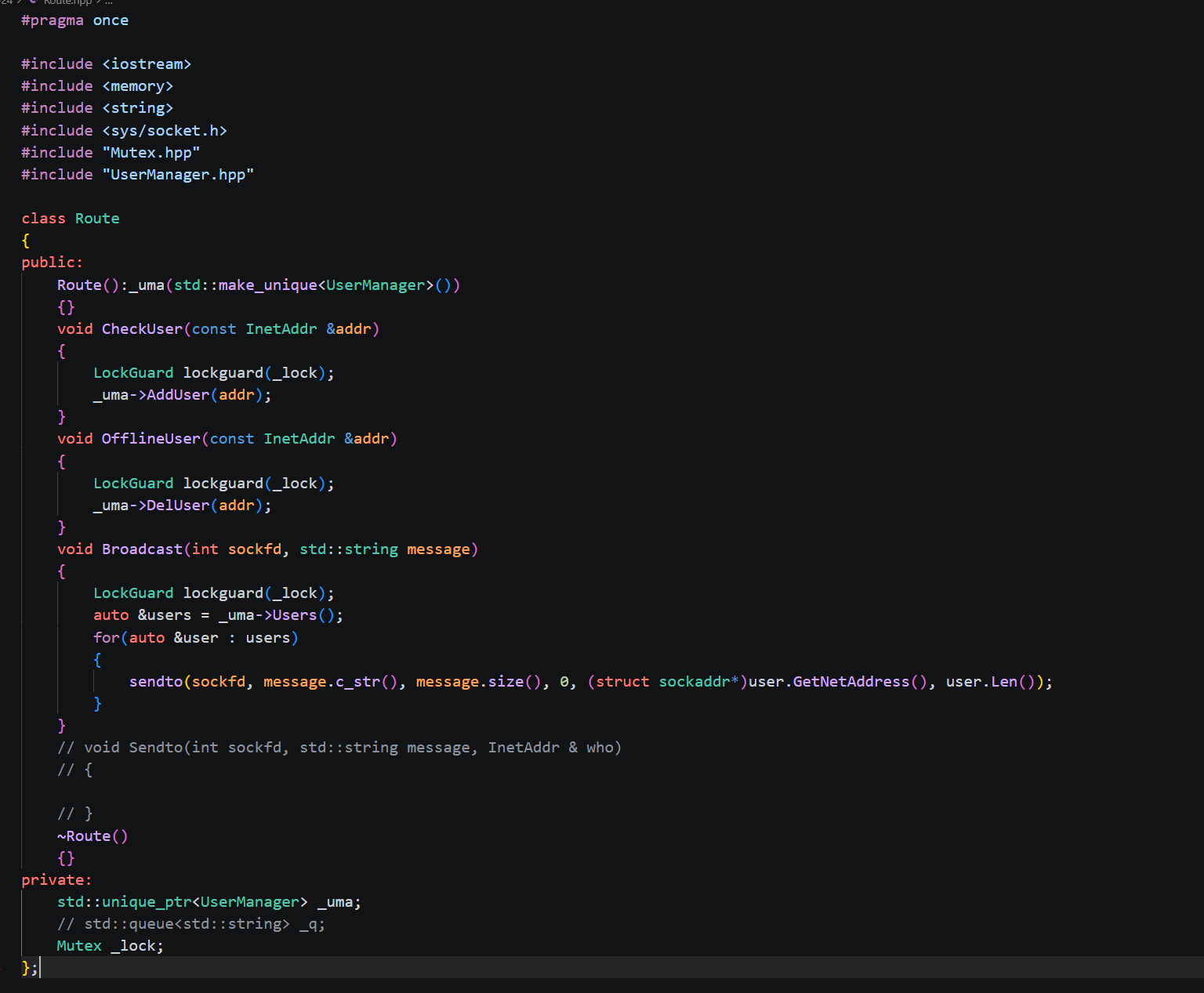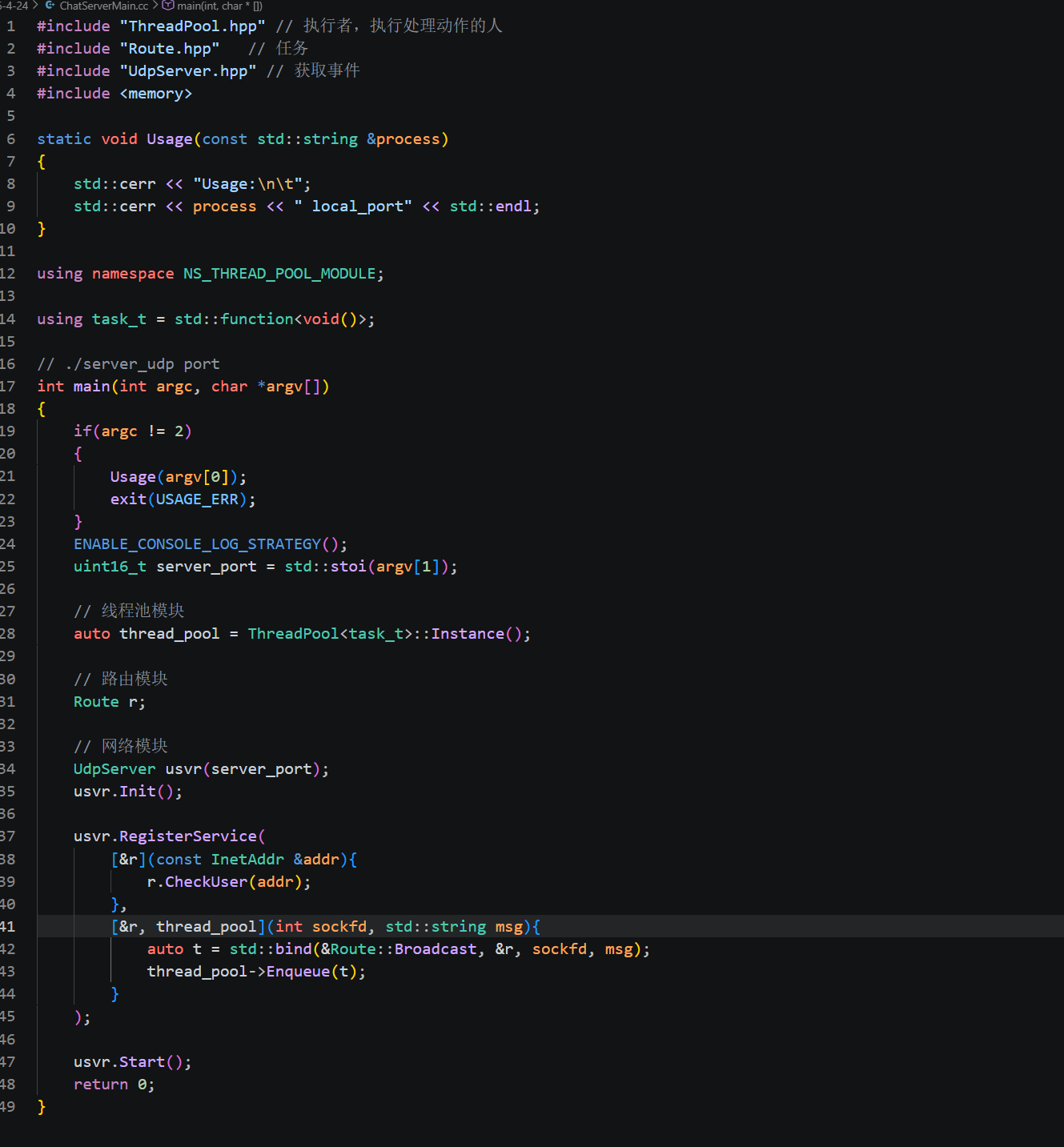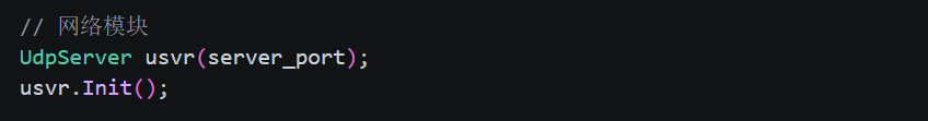最后,我们保留并升级原有的 UDP 网络服务模块 UdpServer。延续字典翻译服务器的回调解耦设计,网络层依然只专注于底层网络 IO 操作,负责创建 Socket、绑定端口、循环接收客户端数据。网络层不再绑定任何具体业务逻辑,而是通过注册回调函数的方式,对接用户管理模块与路由转发模块:收到客户端网络信息时,回调触发用户上线登记逻辑;收到客户端消息时,回调将广播任务提交至线程池。网络层、业务模块、线程池三者完全解耦,各司其职。
