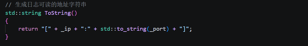 网络调试时,直接打印 sockaddr_in 结构体是乱码,无法识别客户端。这个函数将业务层的 _ip 和_port 拼接为标准格式字符串,日志打印时一眼就能识别客户端身份。后续用户上线日志、消息广播日志、异常调试日志,全部依赖这个接口输出标准化地址,极大降低多客户端场景下的问题排查难度。