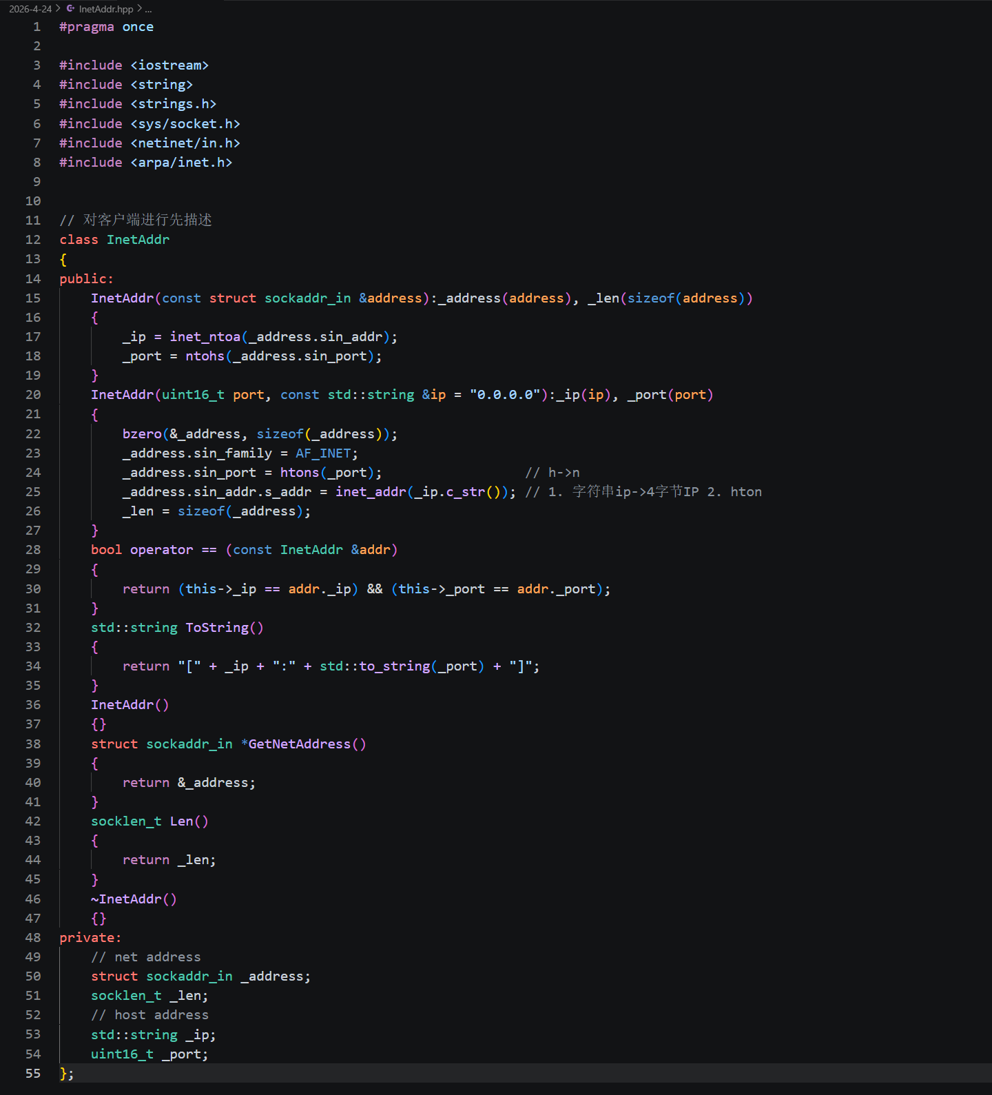 第一步:先定义单个客户端 ------ 我们需要一个类,把客户端的 IP、端口统一封装起来,方便后续的存储以及对客户端的增删查改,这就是 InetAddr.hpp;