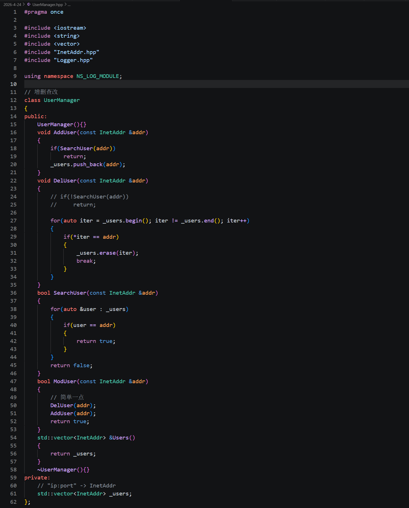 这就需要在 InetAddr 的基础上,搭建专门的用户管理模块 UserManager.hpp ,实现多客户端的增删查改全生命周期管理,这也是我们下一步要落地的核心模块。