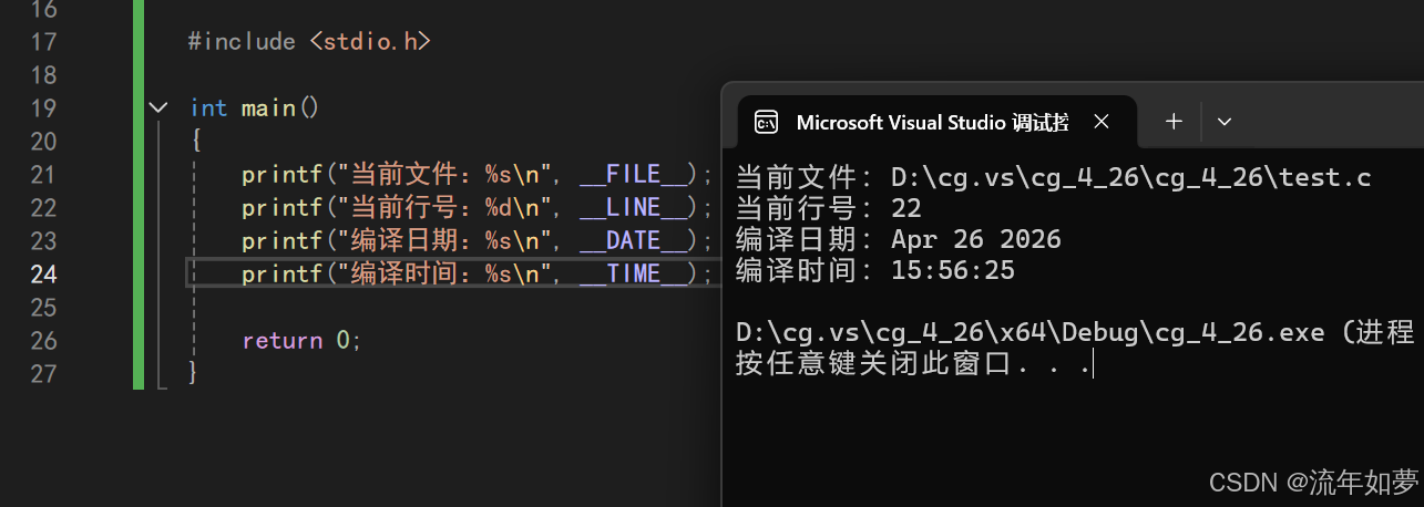 __FILE__--> 当前源文件名__LINE__--> 当前行号__DATE__--> 编译日期__TIME__--> 编译时间__STDC__--> 遵循 ANSI C 则为1