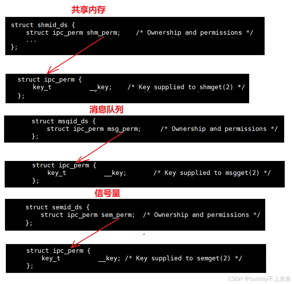 kern_ipc_perm结构体类似于C++基类,而通过kern_ipc_perm又刚好能够找到key 值,所以key就能作为唯一标识区分他们。