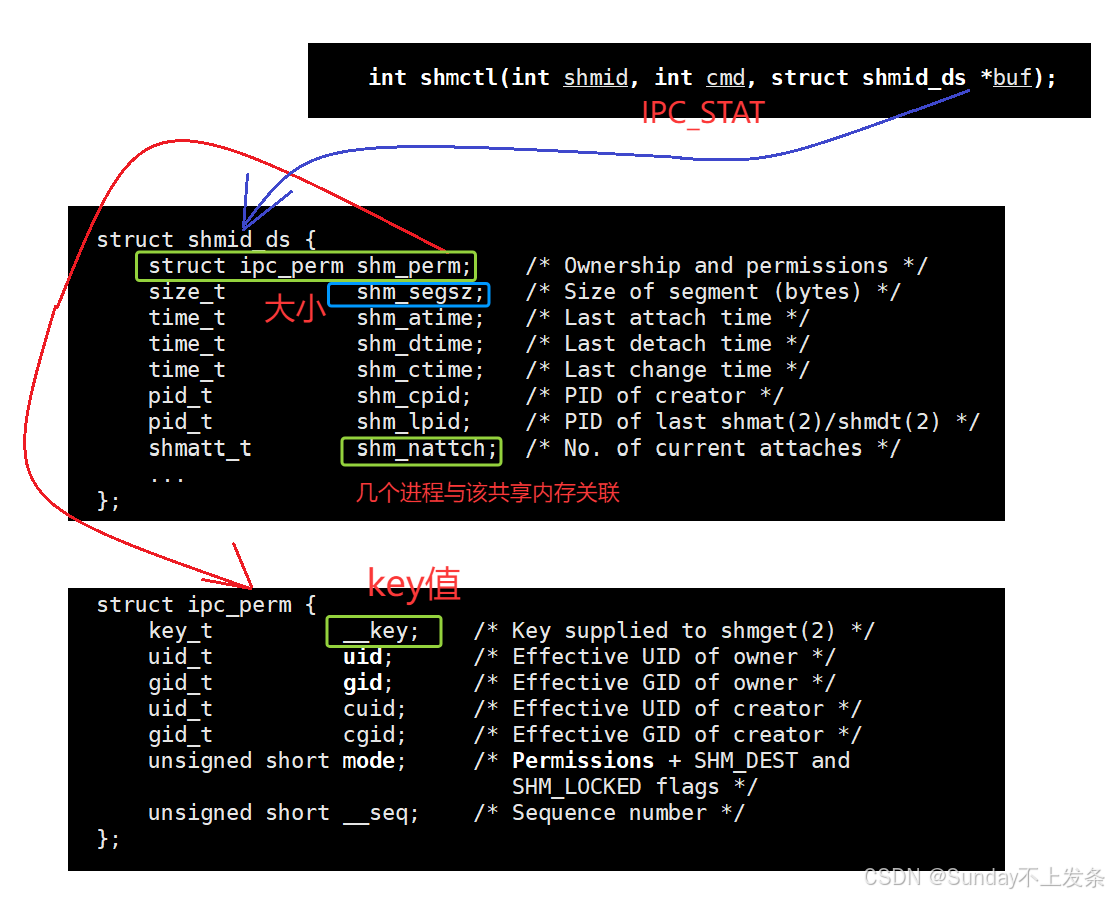 struct ipc_perm shm_perm; // 权限信息(key、uid、gid、mode)