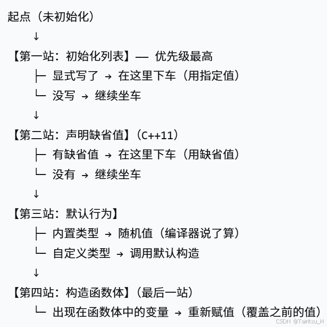 我们可以把成员变量初始化的顺序想象成一个到站下车的过程,也可以看作是优先级问题。第一站是初始化列表,第二站是声明位置的缺省值,第三站是默认构造函数,第四站则是构造函数体。
