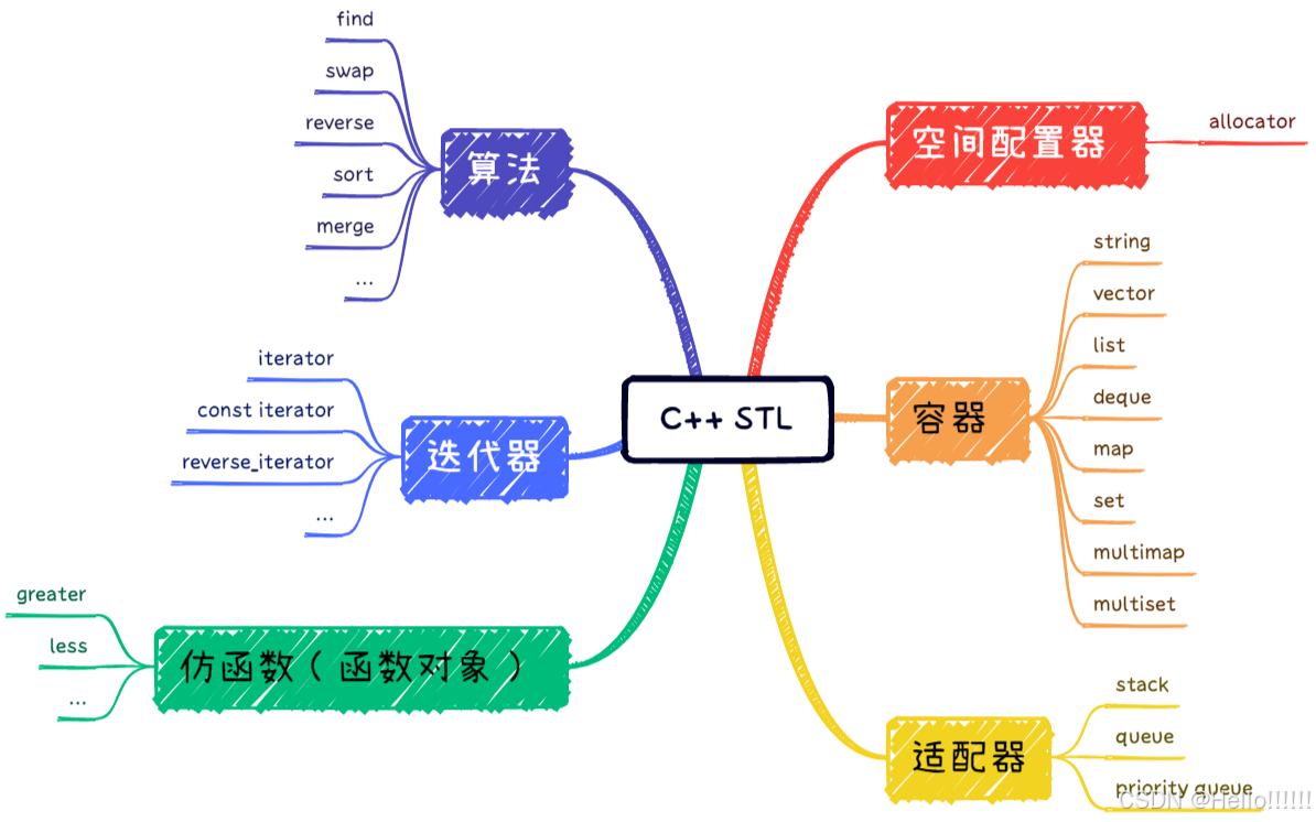 · algorithm和numeric是两大算法头文件,提供100+个标准算法,通过迭代器与容器解耦。