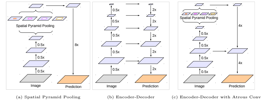 图 1.我们对 DeepLabv3 进行了改进,该模型采用了空间金字塔池化模块(a)以及编码器-解码器结构(b)。所提出的模型 DeepLabv3+ 从编码器模块中获取了丰富的语义信息,而详细的对象边界则通过简单但有效的解码器模块得以恢复。编码器模块允许我们通过应用空洞卷积在任意分辨率下提取特征。