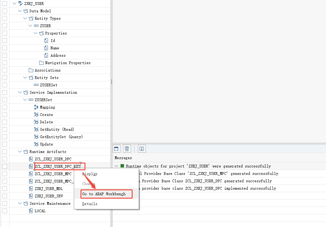 概念 定义 来源 作用 Runtime Artifacts SEGW 生成的所有运行时对象的统称(MPC、DPC、 *_EXT类、服务注册等)自动生成 提供 OData 服务的"骨架":固定了请求与方法的映射、元数据、数据结构 Service Implementation 开发者在 DPC_EXT和MPC_EXT中编写的业务逻辑代码手动编写 填充"血肉":具体的数据读取、插入、更新、删除操作 一个通俗的类比: