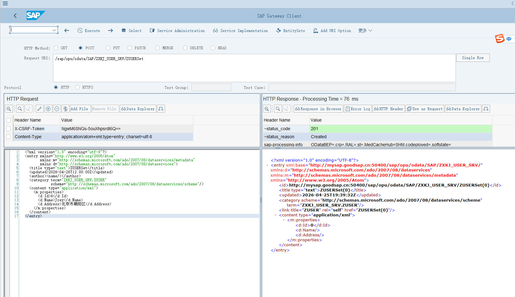 | URL 示例 | /sap/opu/odata/SAP/ZXKJ_USER_SRV/ZUSERSet |