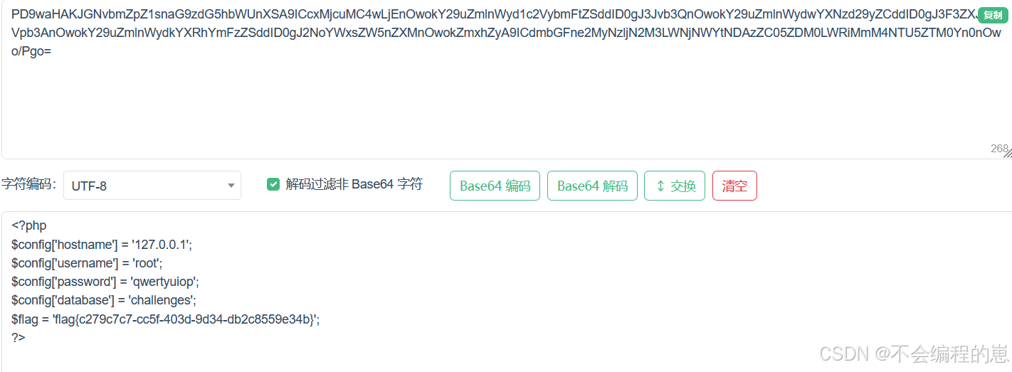 最后访问profile.php,拿到config.php的base64编码,解码即可。文章若是有不对,请多指正。