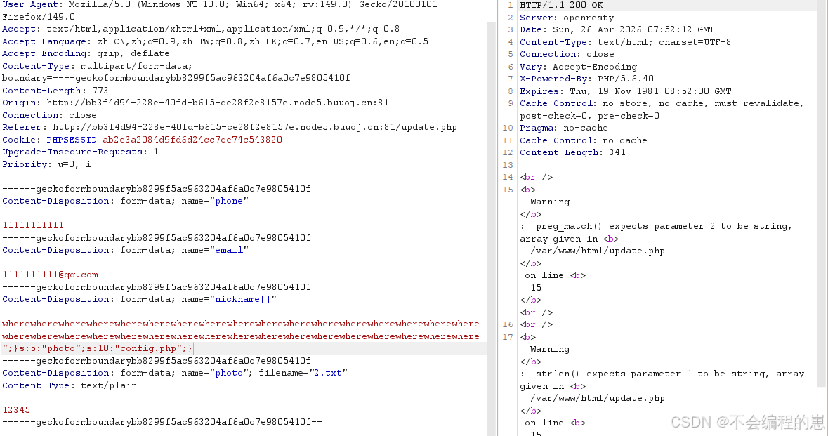 在profile.php里查询信息,然后反序列化。photo会去利用file_get_content函数读内容并base64编码。逻辑大概就清晰了,我们需要在update.php里插入payload,然后利用反序列化覆盖photo为config.php就能拿到flag。这里就要使用到反序列字符串逃逸。由于phone,email有严格的正则匹配,nickname只限制了字母与数字,还有长度。所以nickname就是构造点。我们先看一下正常的学序列化