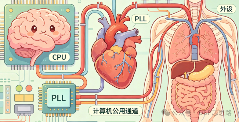 如果说CPU是大脑,那么PLL(锁相环)就是芯片的"心脏"。人体的心脏负责泵血,将氧气和营养输送到身体的每一个细胞,维持身体的正常代谢和运转;一旦心脏停止跳动,整个身体就会陷入瘫痪。PLL的作用和心脏完全一致,它负责为芯片的各个部件提供"稳定的时钟信号",就像心脏提供稳定的供血,是芯片正常运转的"动力源泉"。