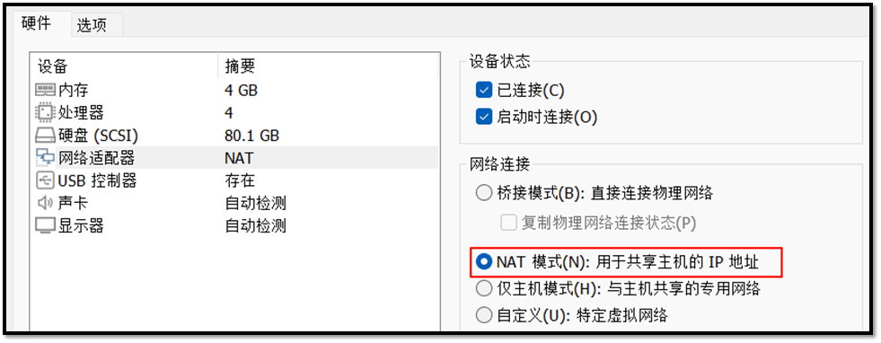 注意:Kali使用NAT模式,比较稳定。只要主机有网络,虚拟机就有网络(校园网检测不出来,虚拟机内网私有IP,校园网 只能看到电脑一台设备)