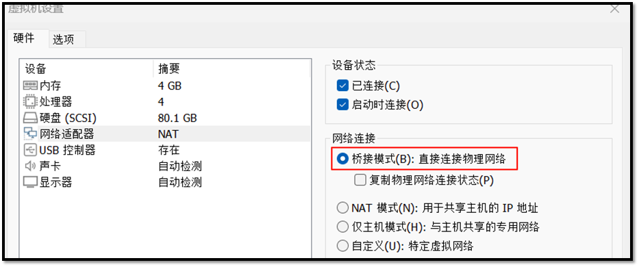 注意:校园网不能桥接,因为运营商做了限制,而且校园网需要认证(需要学号和密码,校园网不是自动分配,而是认证后才会分配),桥接只会让虚拟机成为独立设备,所以不行