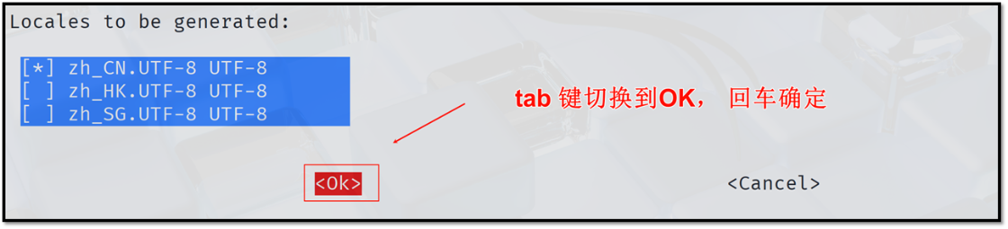 2.按tab 键选择到 OK 然后回车