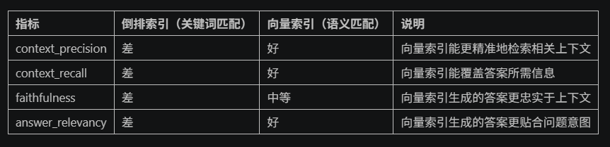 "ground_truth": ["RAGAS 提供了多种评估指标,如 Answer Relevance、Context Precision 等。切片长度和滑动窗口配置对检索性能有重要影响。", "倒排索引适用于关键词匹配,而向量索引适用于语义匹配。向量索引需要更多计算资源,但能捕捉语义相似性。"]