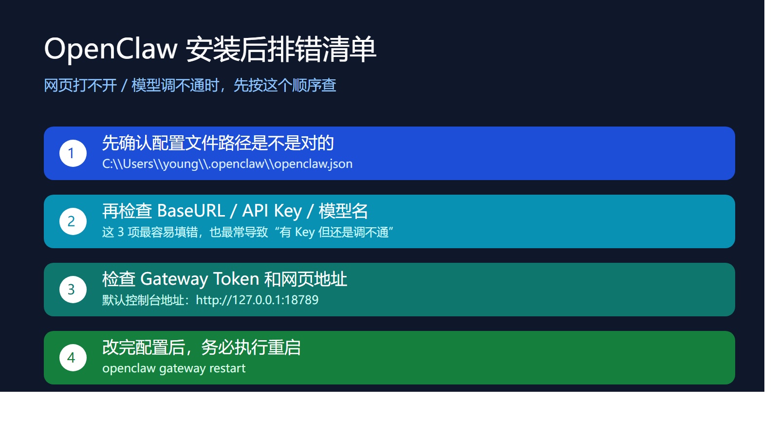 如果你只是想先把 OpenClaw 跑起来,不想一开始研究太多高级配置,可以直接按下面这条最短路径走: