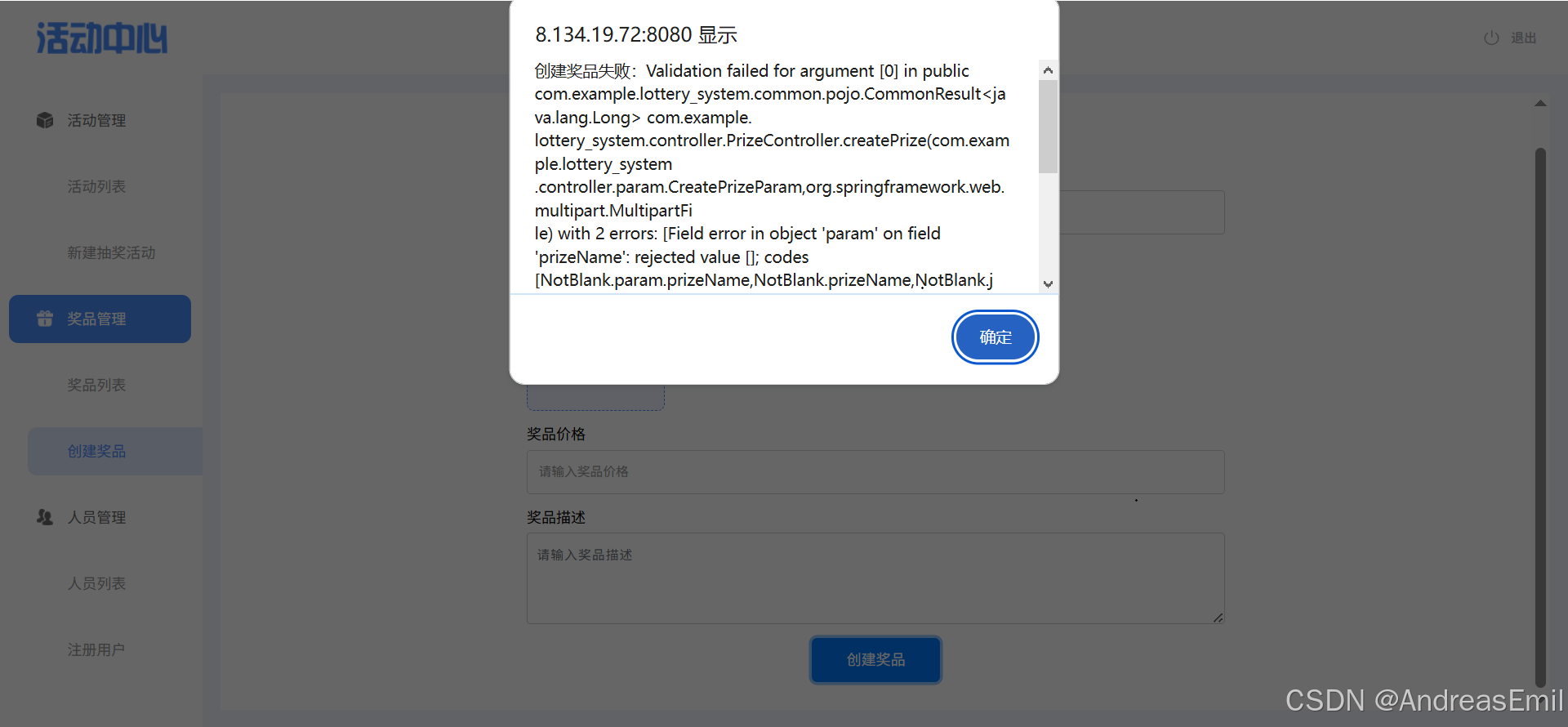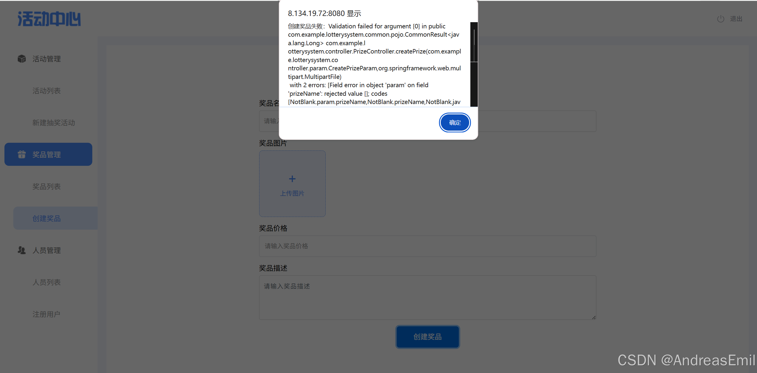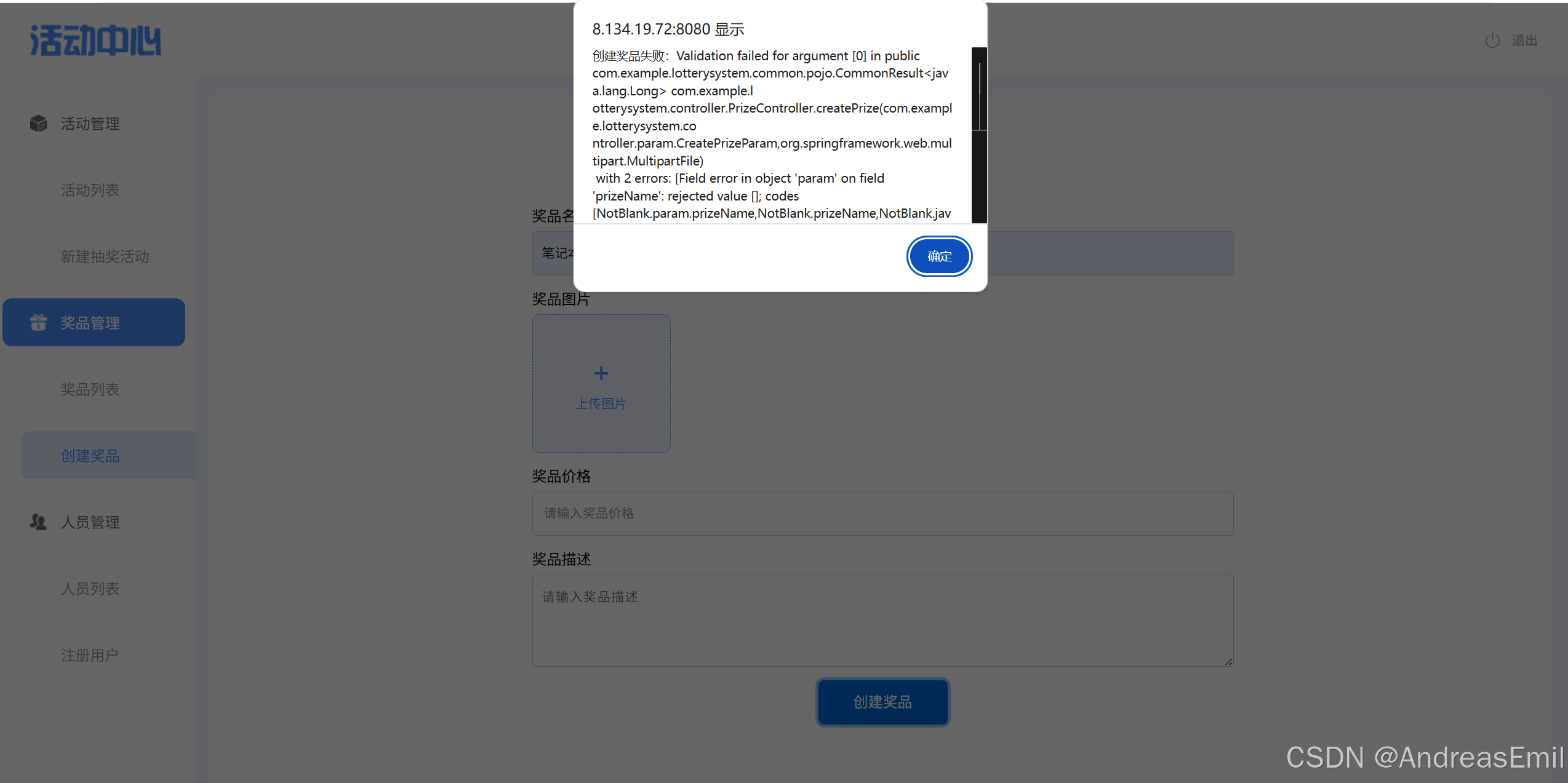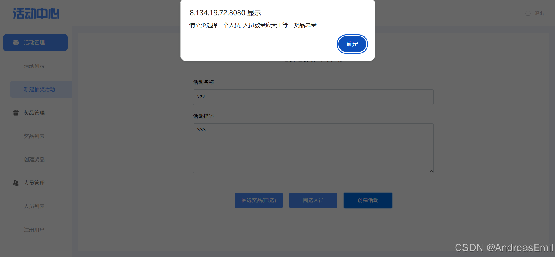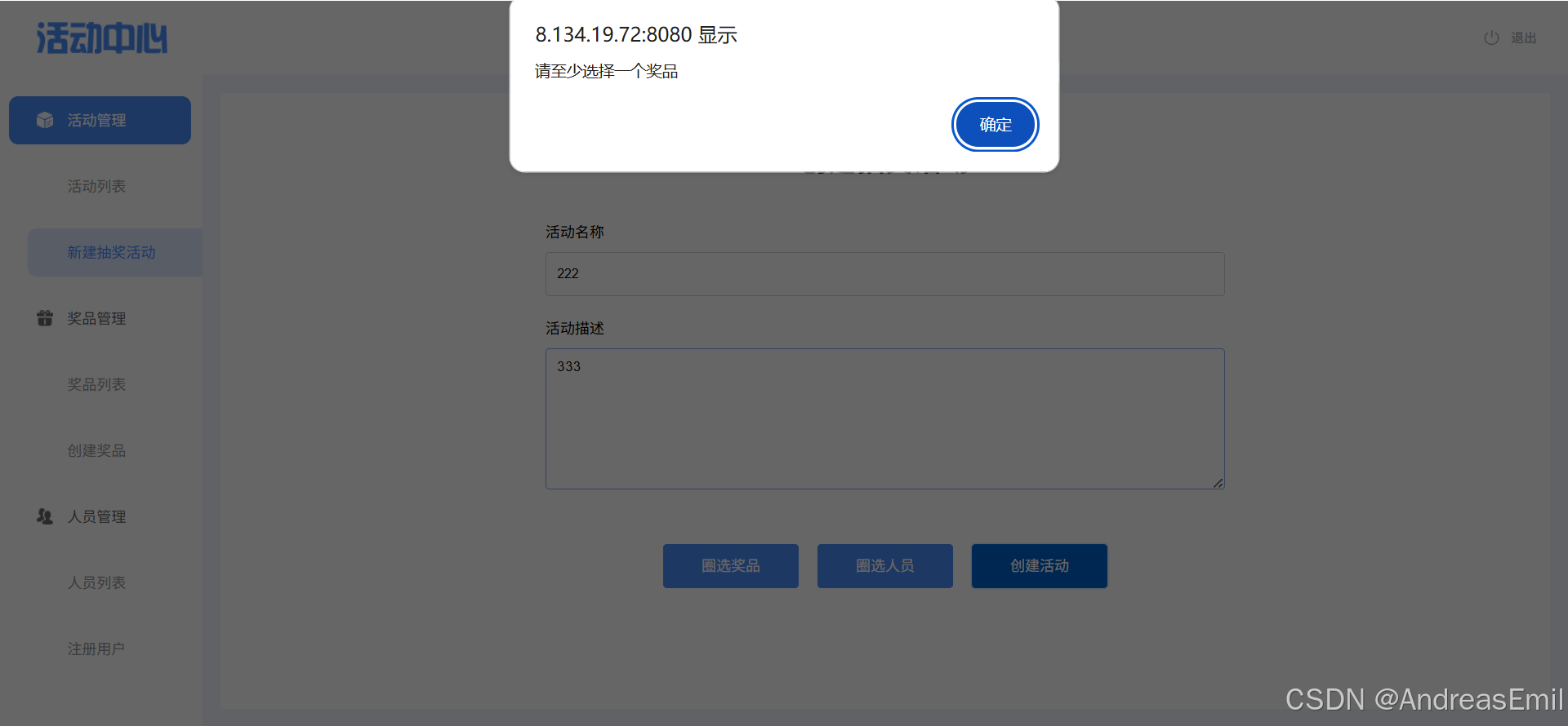 测试场景二:填写活动名称和奖品描述,未圈选奖品和人员