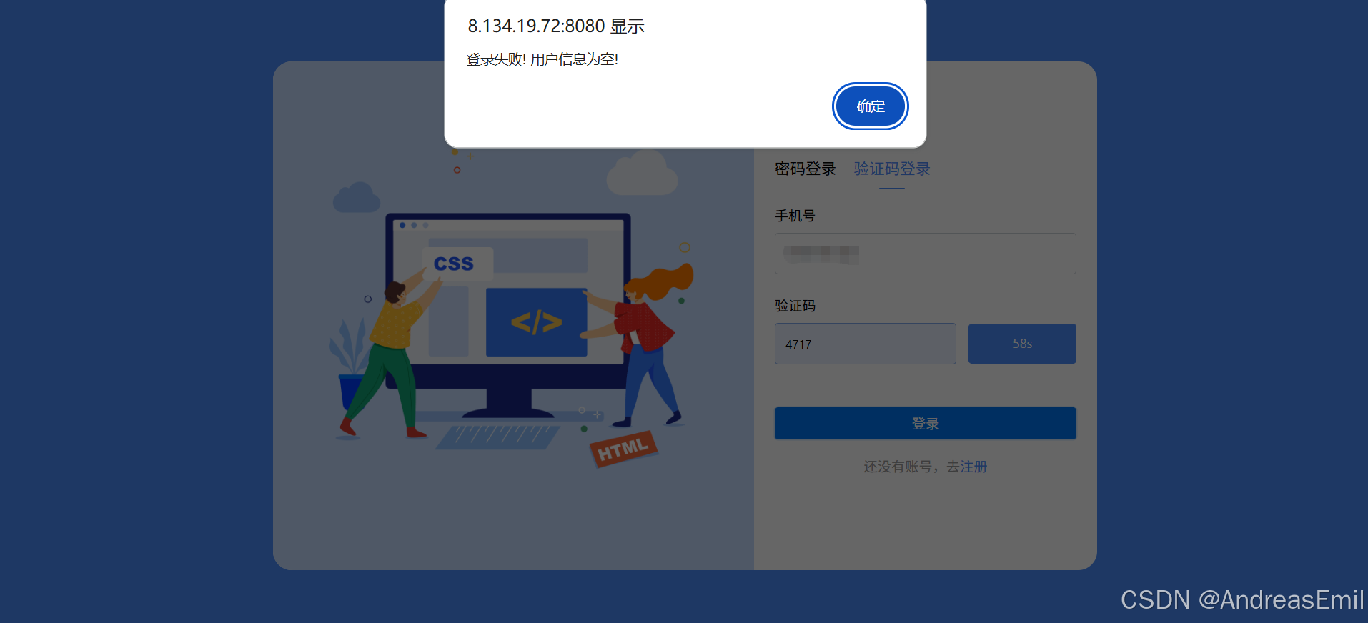预期结果:弹窗提醒"登录失败用户信息为空"