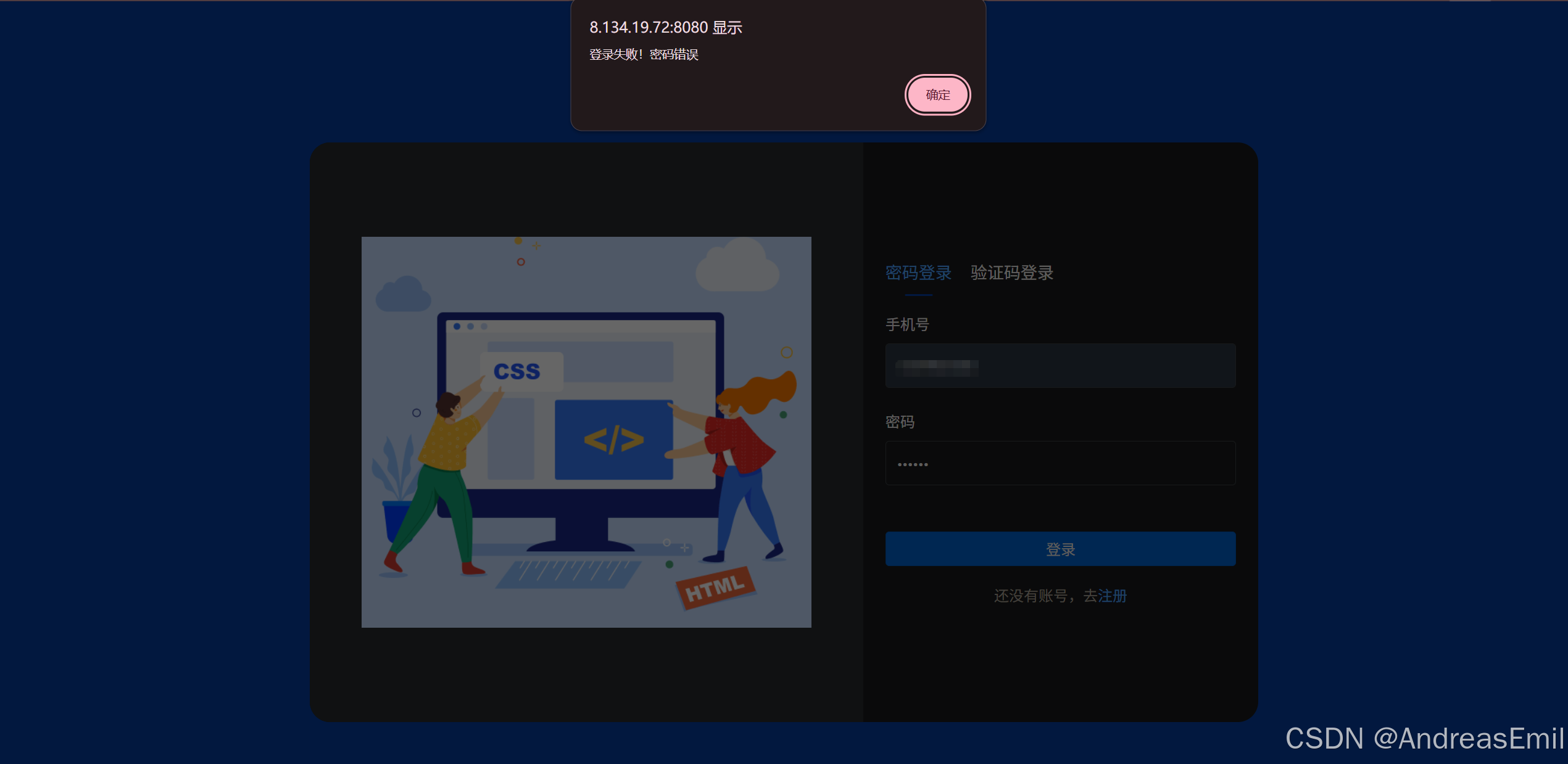 测试场景五:手机号正确,密码错误(密码格式正确)