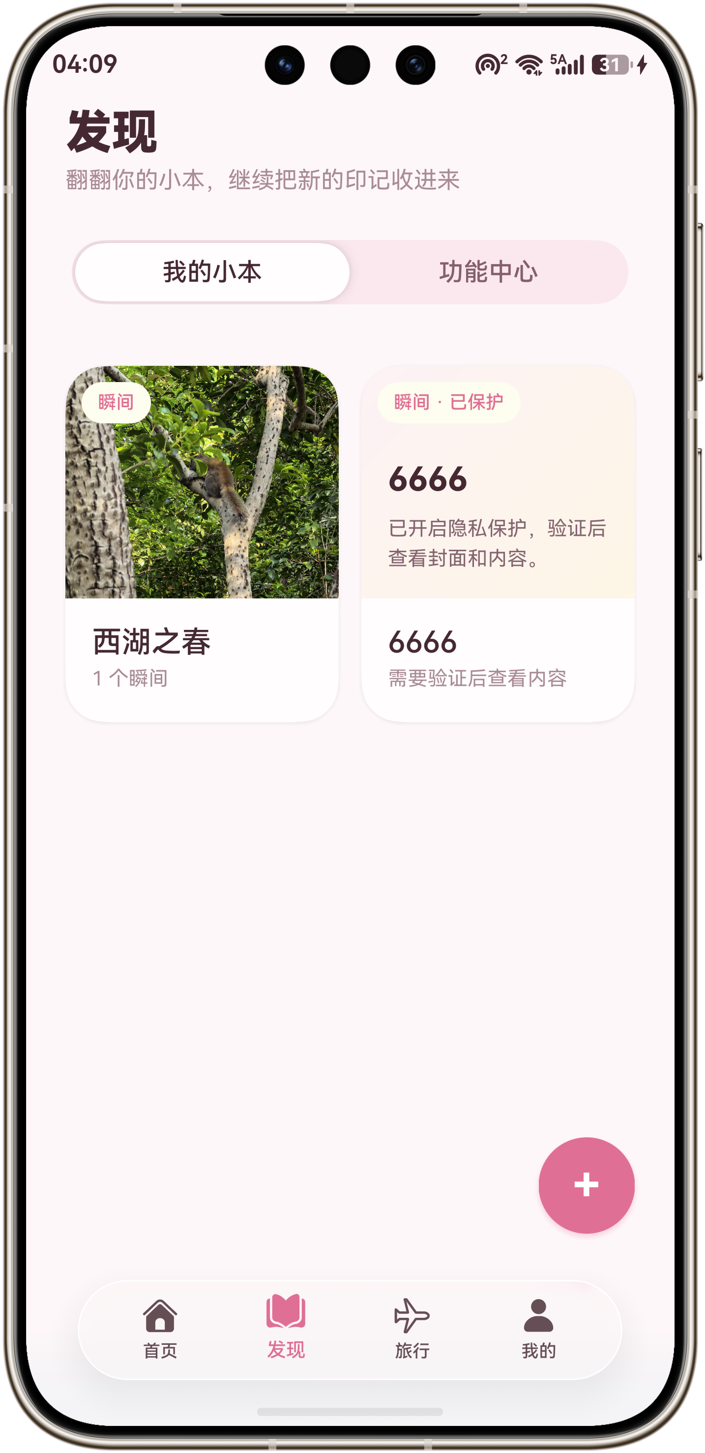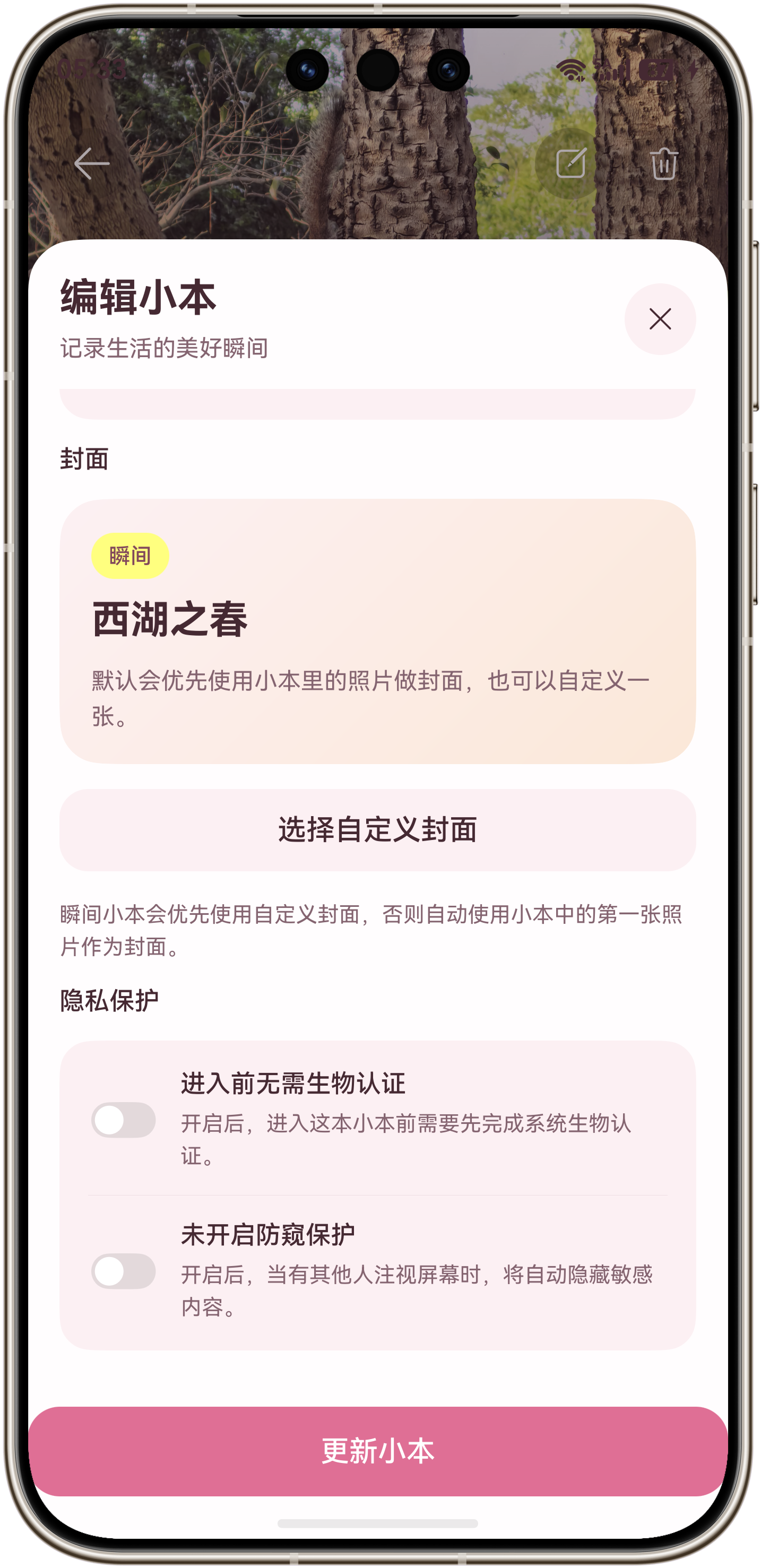 《时光旅记》里有一个"隐私保护小本"的功能。用户可以把一些照片、随笔、旅行瞬间放进一个受保护的小本里。这个场景有一个很明确的要求:不是所有内容都需要上锁,但只要用户主动开启了隐私保护,进入小本、编辑小本、开启或关闭隐私保护时,都应该先确认一下当前操作的人是不是机主本人。