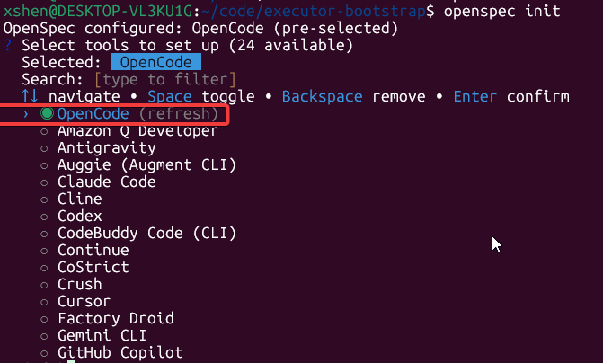 openspec init # 初始化成功后,会在项目目录下创建 .openspec/ 和 .opencode/ 等目录