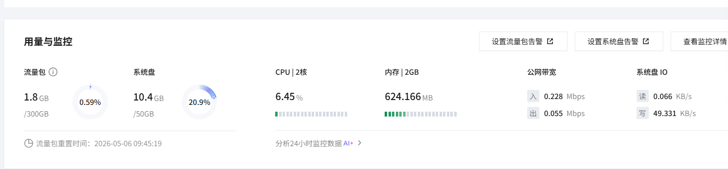 但当我兴冲冲地准备在云服务器上部署Ollama本地模型时,打开监控面板一看: