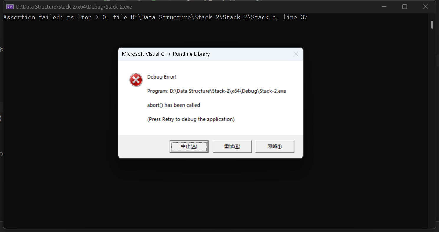 此时再执行两次出栈函数,看是否会引发断言